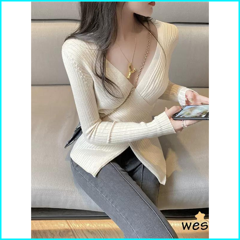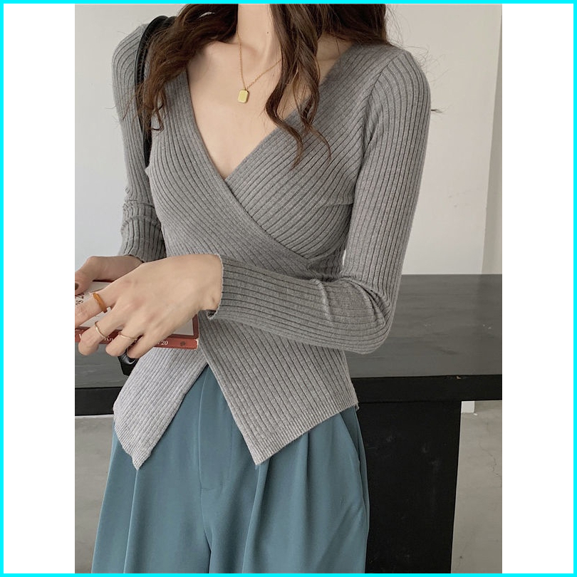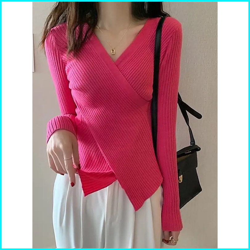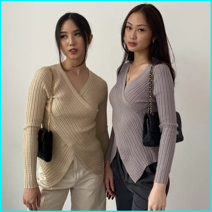 Jiso Knit V-neck Korean Style Wrap Top - Atasan Rajut Wanita Lengan Panjang