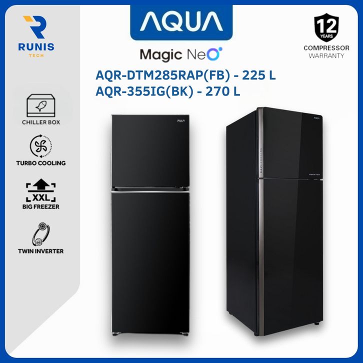 KULKAS 2 PINTU INVERTER AQUA AQR-DTM285RAP(FB) 225-350 LITER LOW 40 WATT WARNA HITAM BLACK FREEZER BESAR GRATIS ONGKIR