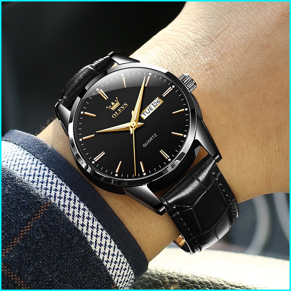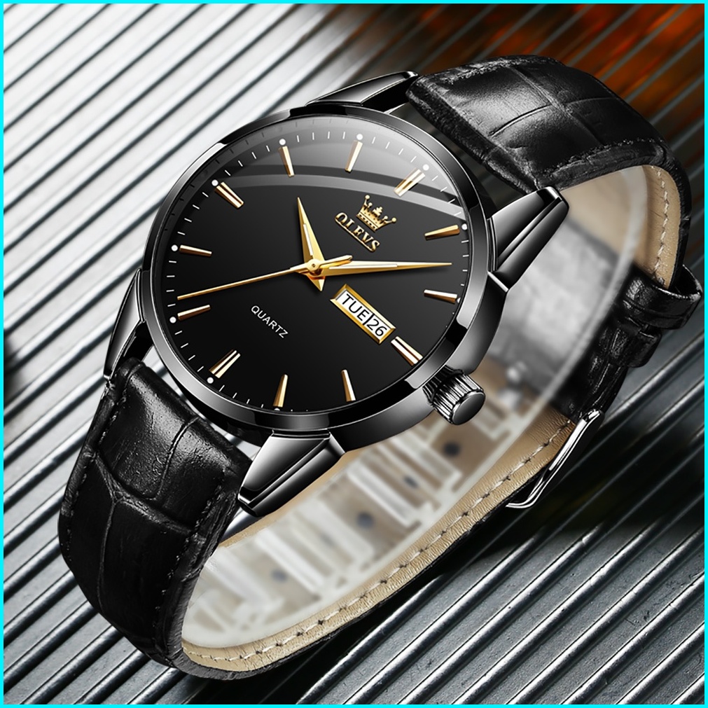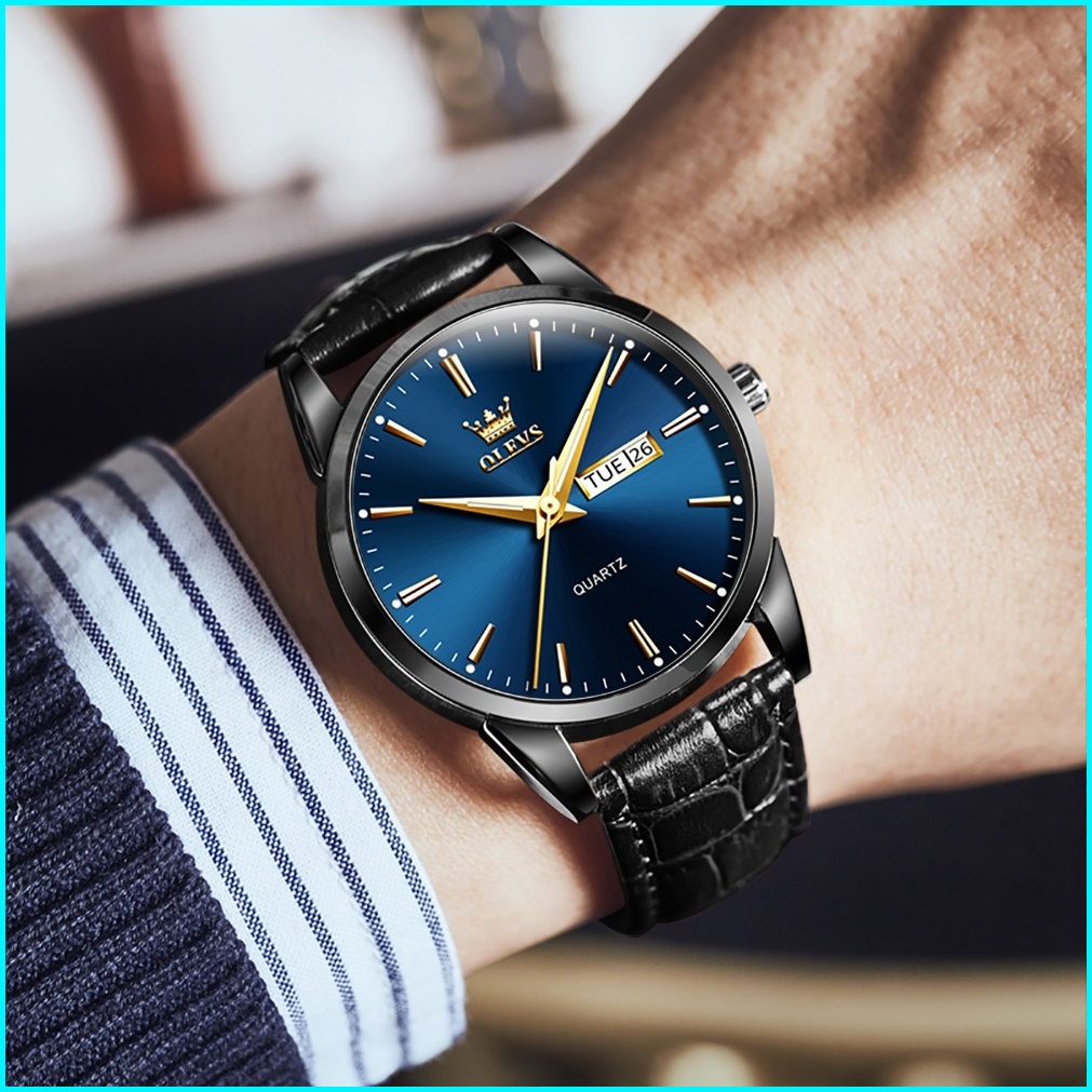 Olevs Jam Tangan Pria Original Anti Air Tahan Kulit Analog Men Watch Hitam Putih Biru