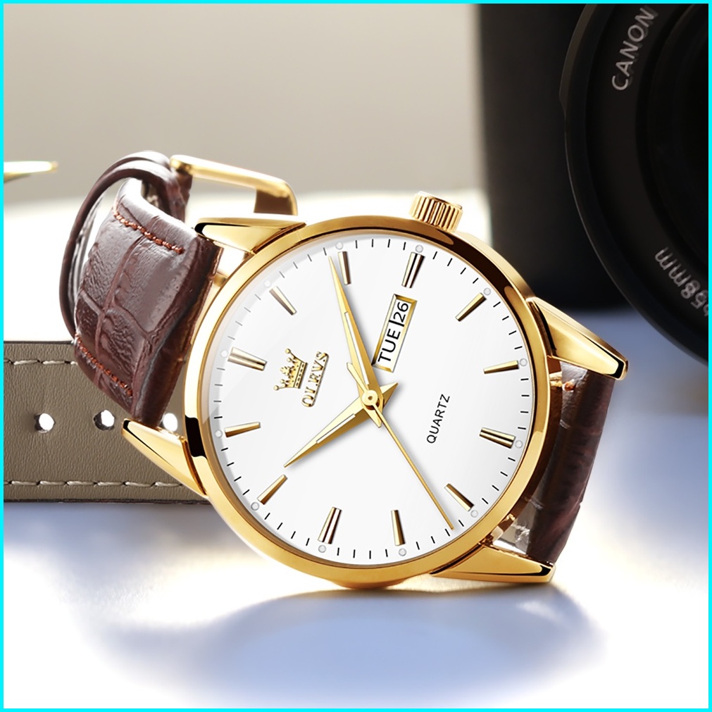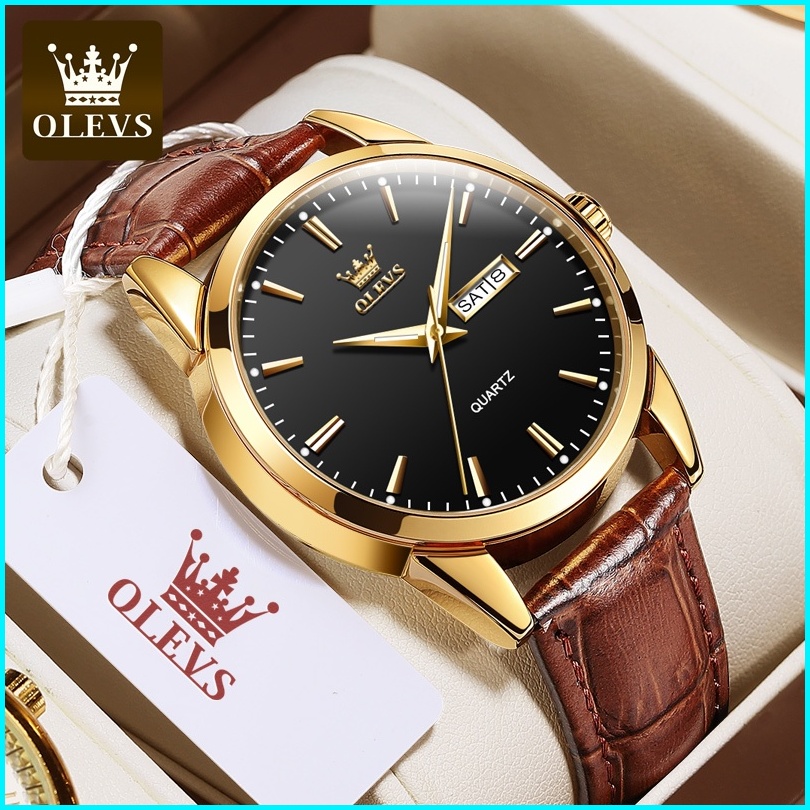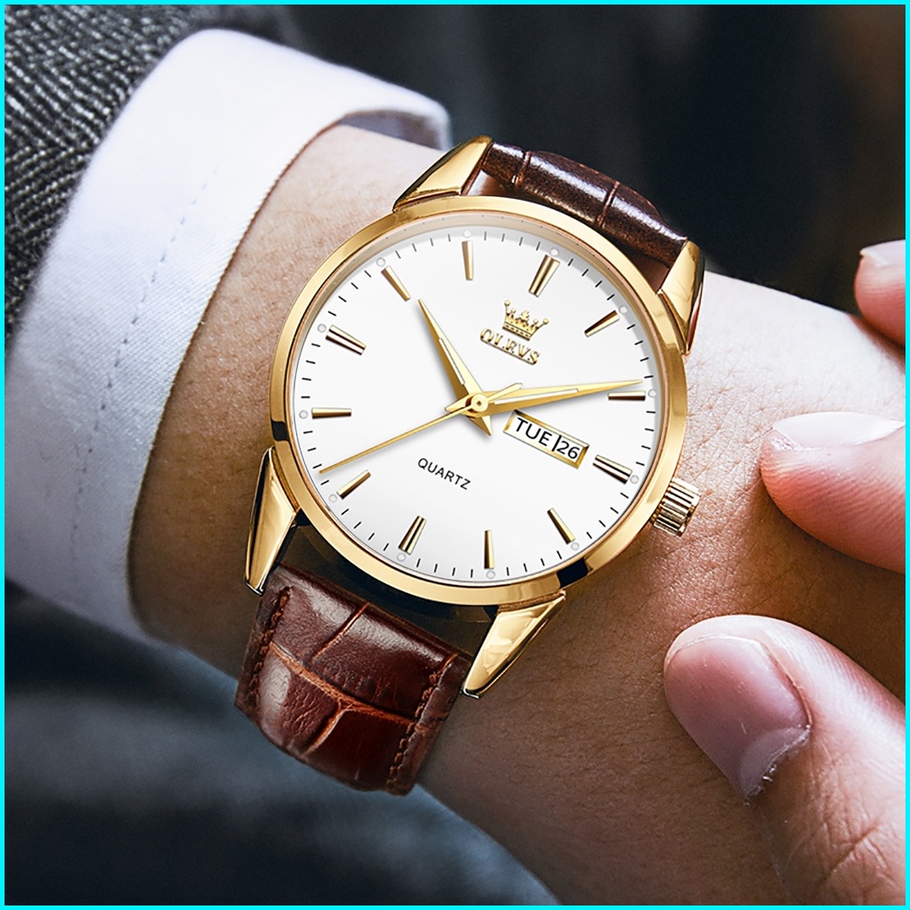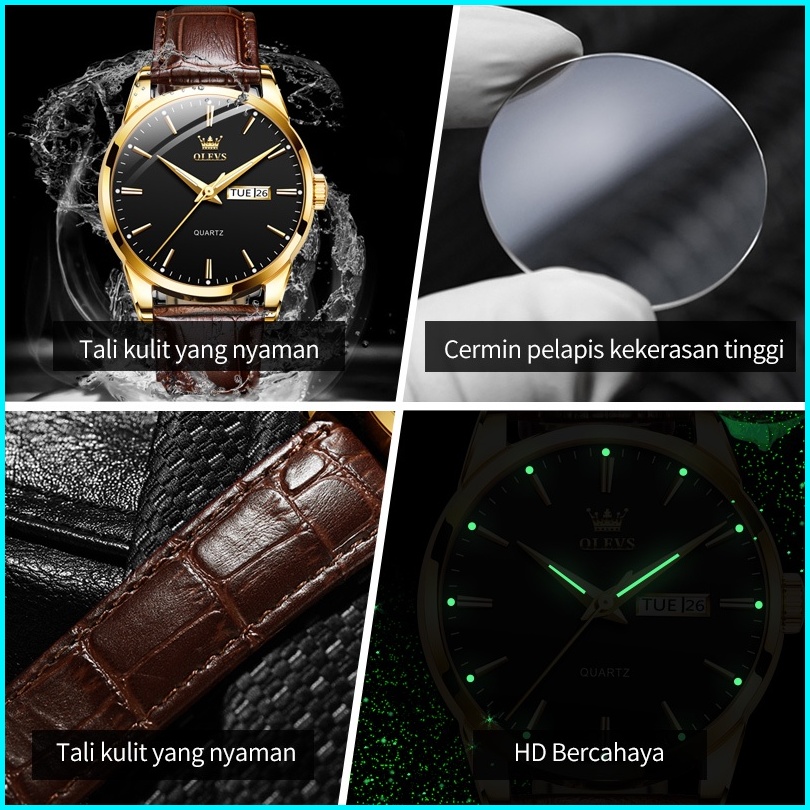 Olevs Jam Tangan Pria Original Anti Air Tahan Kulit Analog Men Watch Hitam Putih Biru