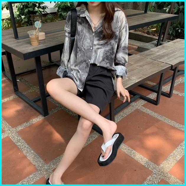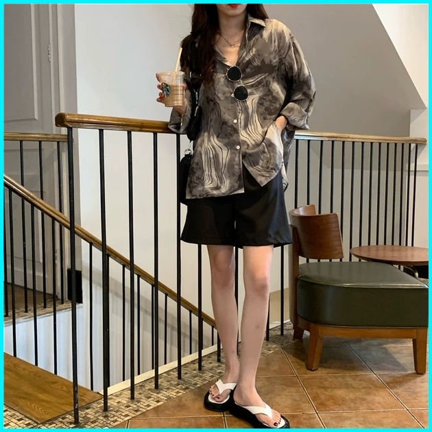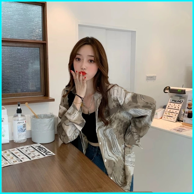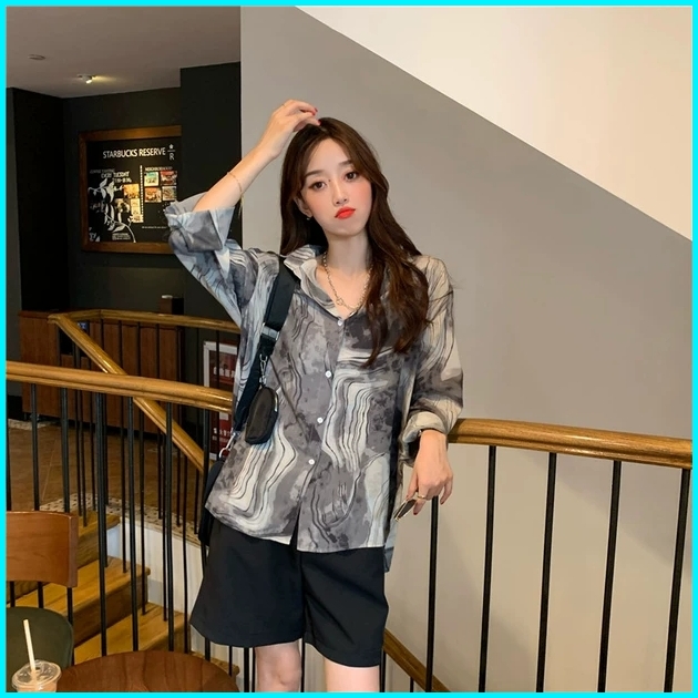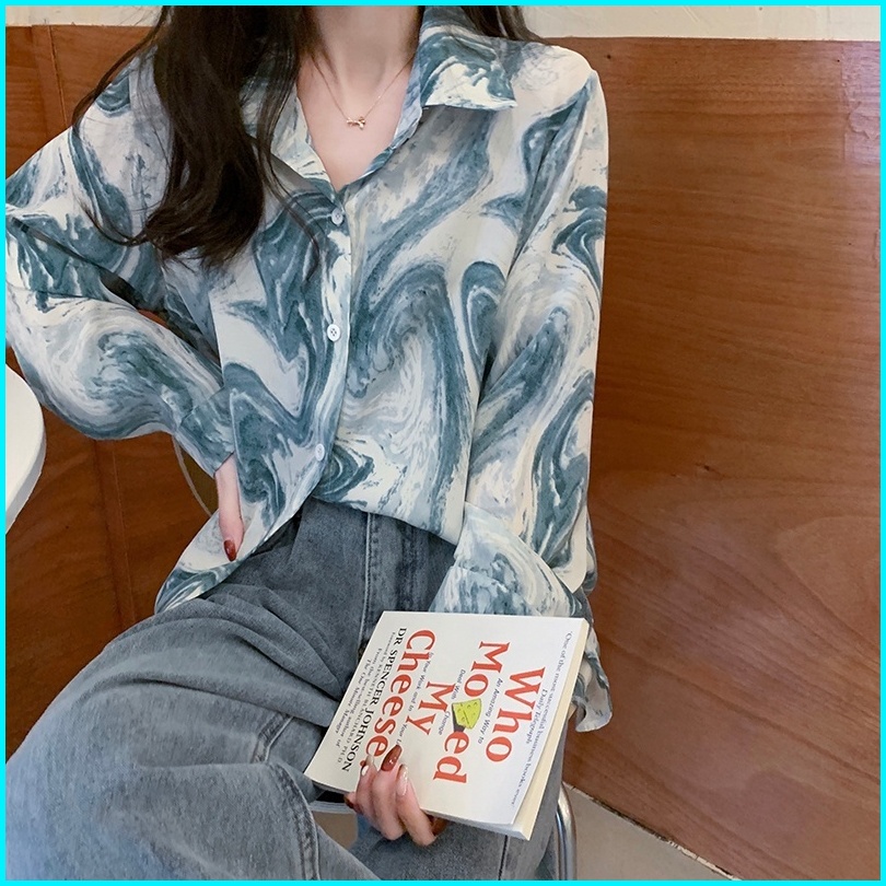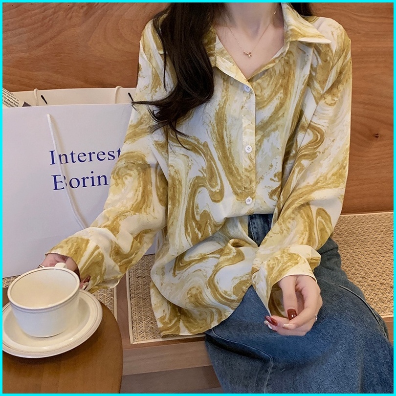 Yikoo-kemeja Korea Lengan Panjang Bermotif Vintage Shirt Atasan Blouse Wanita