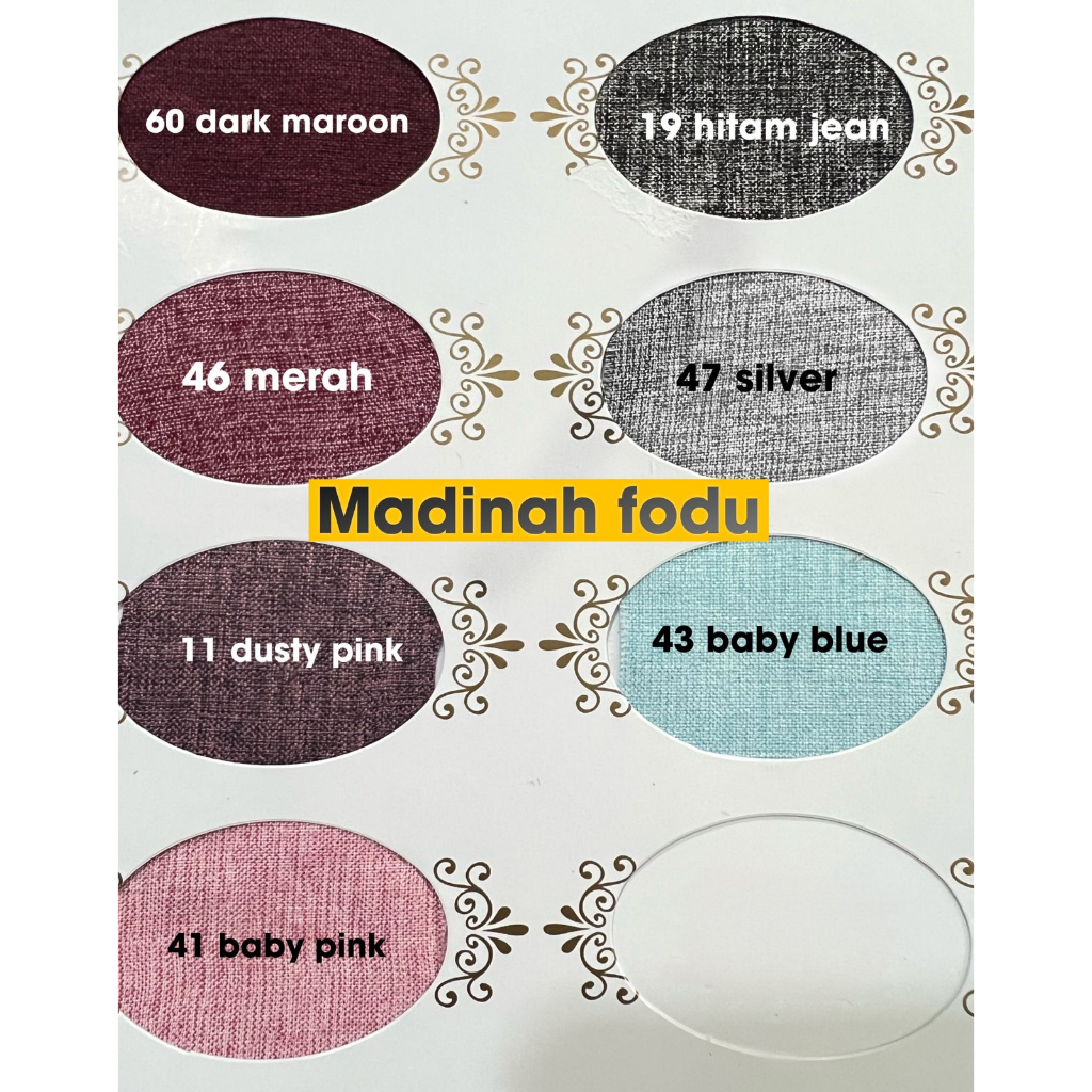 ROL 3 maroon muda, ROL 10 carat madina, ROL 11 dusty pink, ROL 16 seledri, ROL 17 coffee madina, ROL 18 chocolate, ROL 19 hitam jeans, ROL 48 blue jean, ROL 23 dark navy, ROL 27 dusty navy, ROL 28 hj botol, ROL 37 rustic, ROL 38 cream, ROL 41 baby pink, ROL 42 soft olive, ROL 44 tosca tua, ROL 47 silver, ROL 14 army, ROL 46 merah, ROL 45 mocca, ROL 43 baby blue, ROL 63 baby jean, ROL 60 dark maroon, ROL 64 dusty blue, ROL 62 khaki, ROL 61 nude peach, ROL BW, ROL Putih Bersih