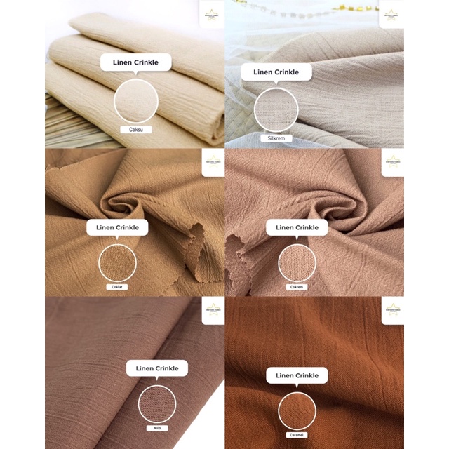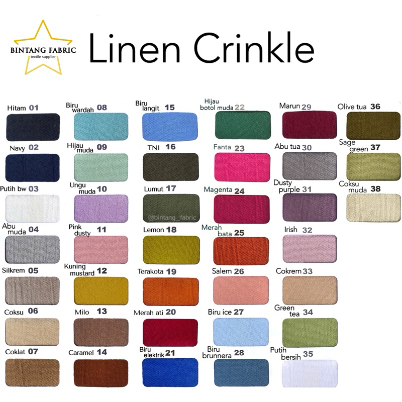 Hitam, Navy, Putih bw, Abu muda, Silkrem, Coksu, Cokelat, Biru wardah, Hijau Muda, Ungu muda, Pink dusty, Mustard, Milo, Caramel, Biru langit, Tni, Lumut, Lemon, Terakota, Merah ati, Biru elektrik, Hijau Botol Muda, Fanta, Magenta, Merah bata, Salem, Biru ice, Biru brunnera, Marun, Abu Tua, Dusty purple, Irish, Cokrem, Green tea, Putih bersih, Sage green, Coksu muda, Olive tua, Warna lain dikatalog, Kopi