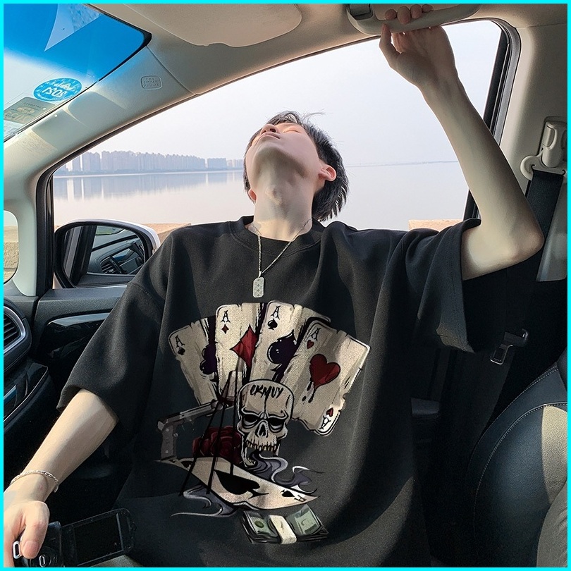 Auzy Kaos Pria Vintage Skull Playing Cards Dark Baju Distro Original 100 Retro Style Tshirt Longgar Kaos Import