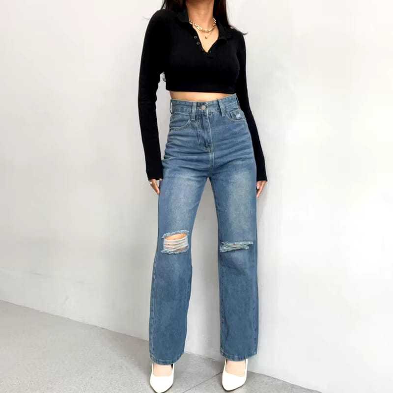 (Gratis Ongkir) Highwaist Loose Jeans Wanita - Celana Jeans Wanita Sobek - Baggy Jeans Hangover