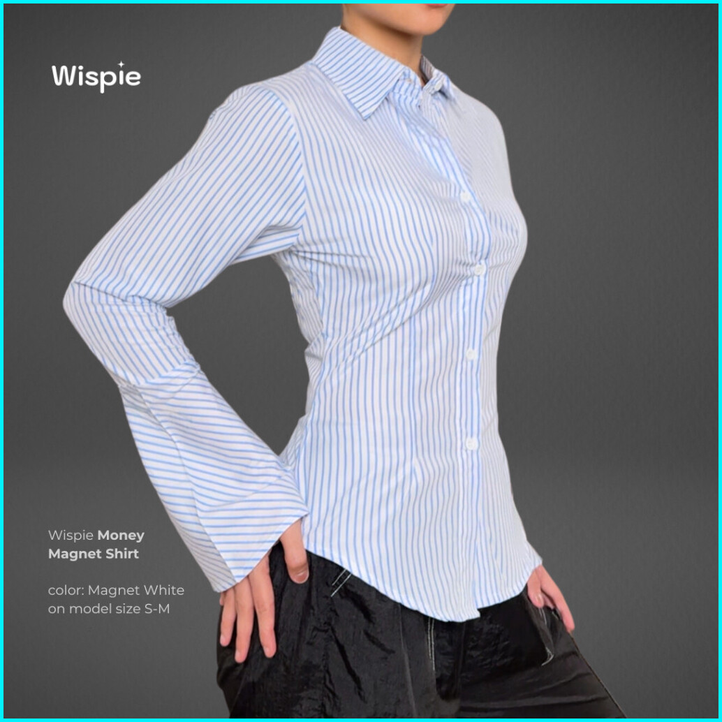 Wispie Money Magnet Fitted Shirt Kemeja Kerja Wanita Press Body Pinstripe Salur Pink Biru Berkaret