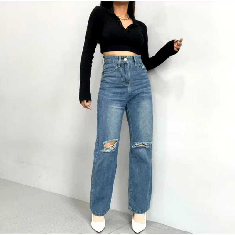 (Gratis Ongkir) Highwaist Loose Jeans Wanita - Celana Jeans Wanita Sobek - Baggy Jeans Hangover