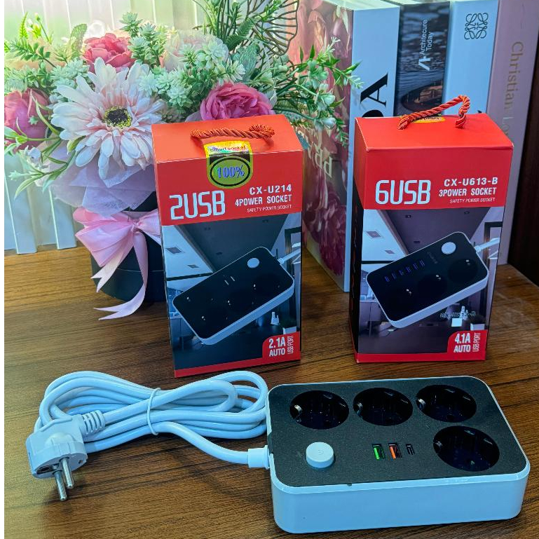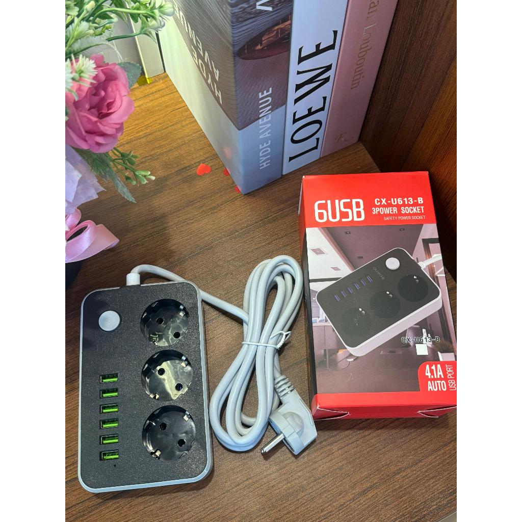 < SMARTCOM > Terminal Colokan Listrik 2 USB + 4 Socket Europe + 1 Type C Power Socket Strip
