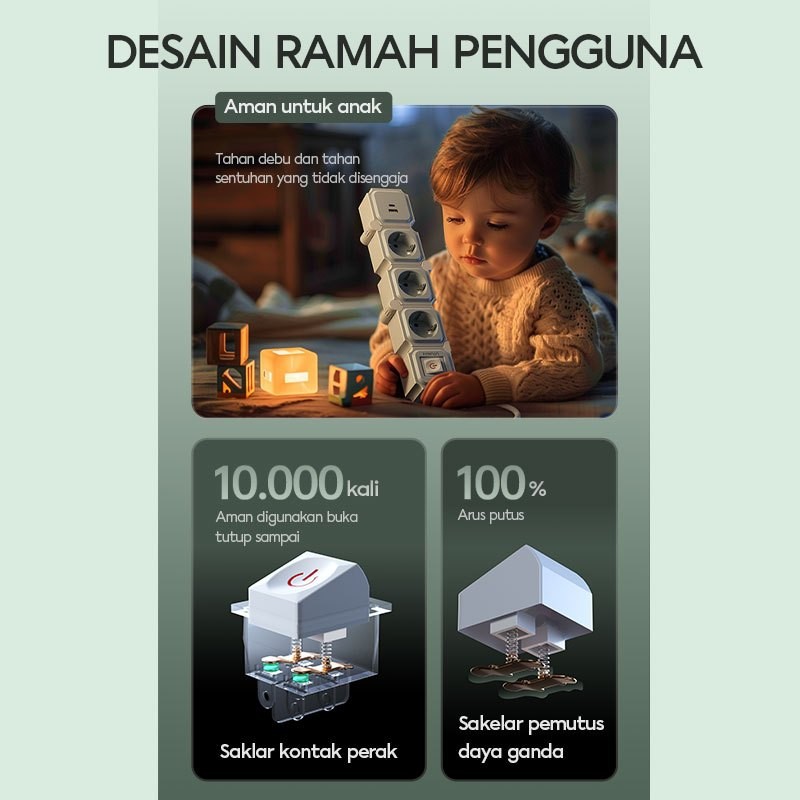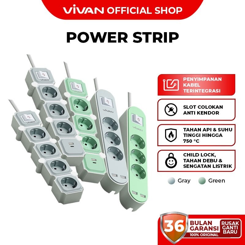 VIVAN Safety Socket Stop Kontak + Kabel 1.8 Meter dengan 3-6 Lubang USB A + Type C Adaptor Steker Power Strip VPS-H PRO