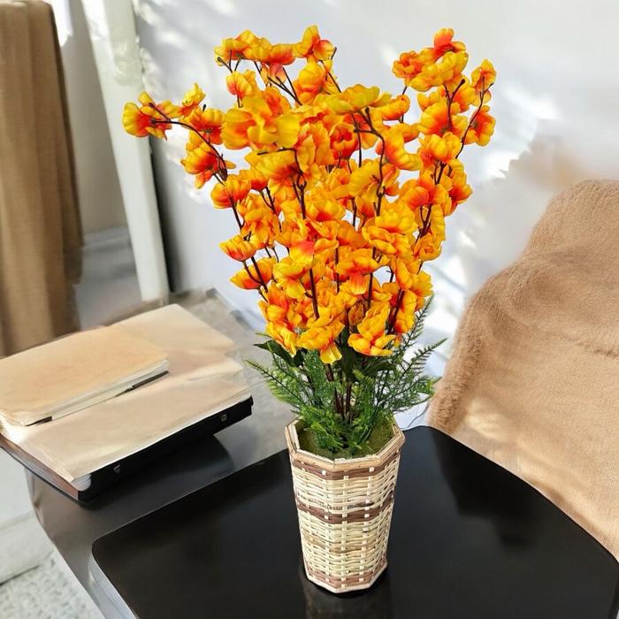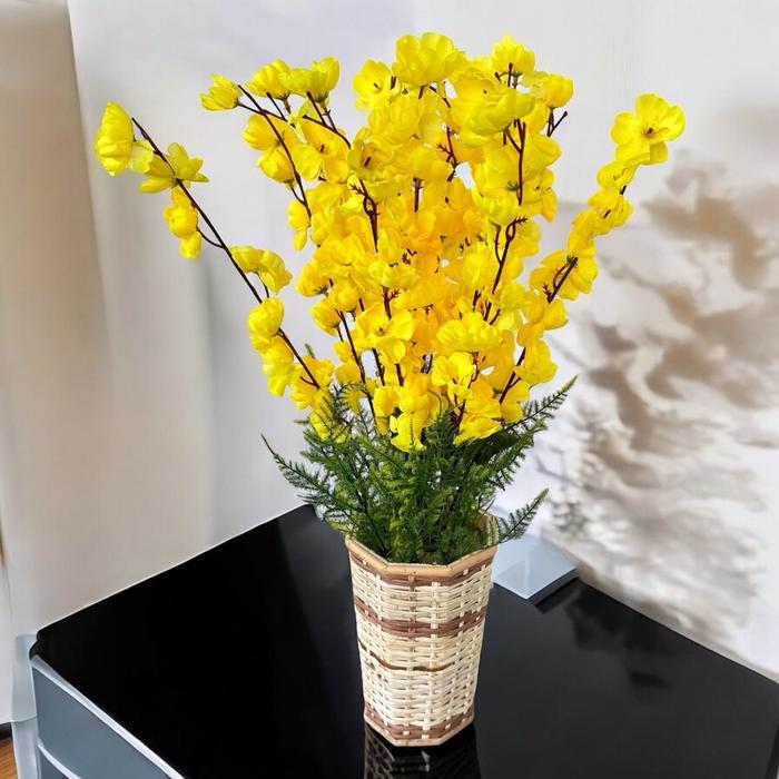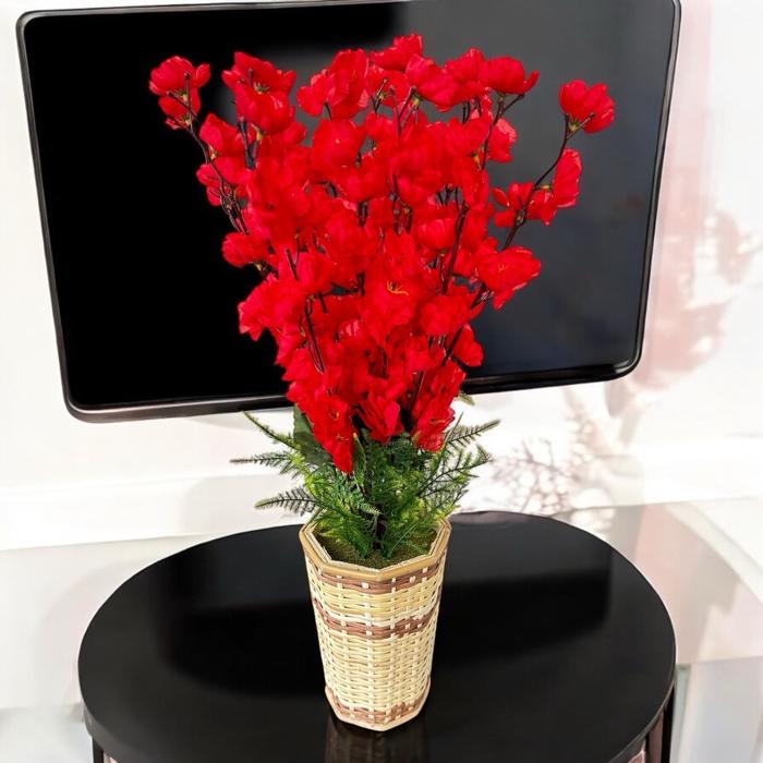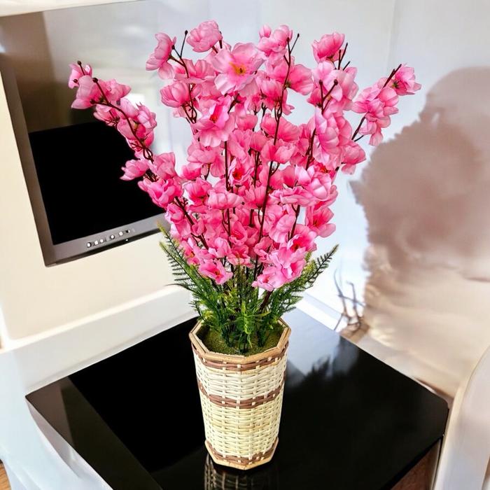 BUNGA SAKURA MEIHUA 14 CABANG DENGAN POT ROTAN BUNGA PELASTIK