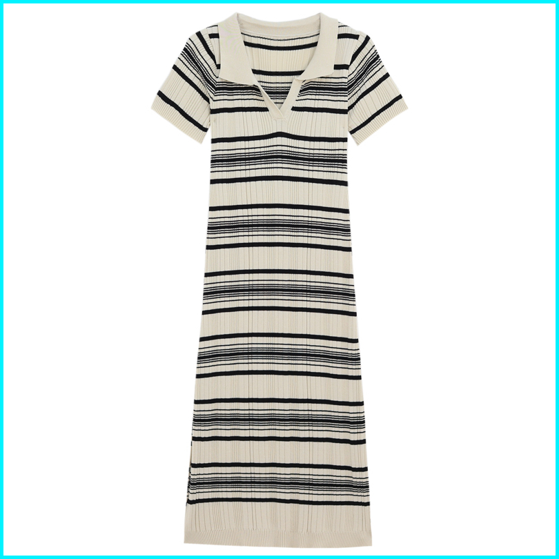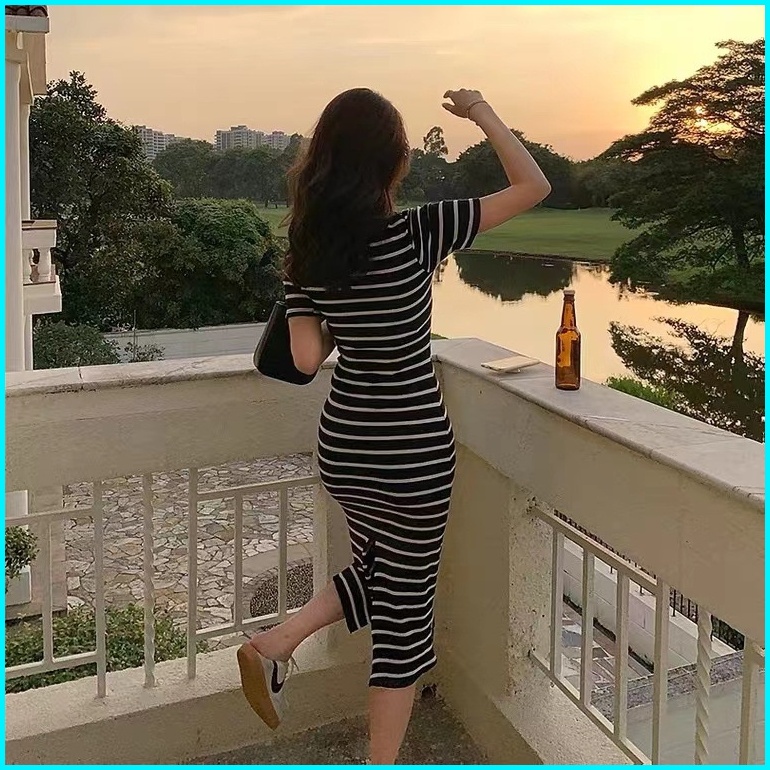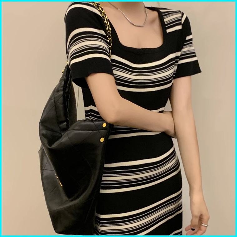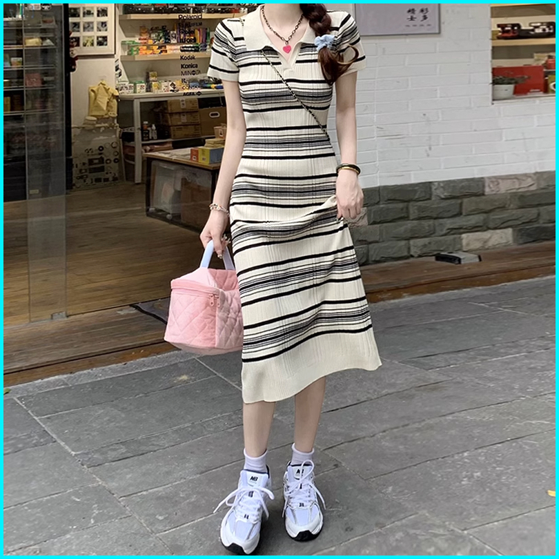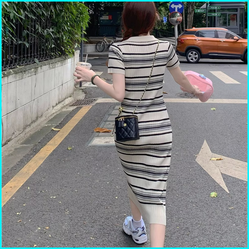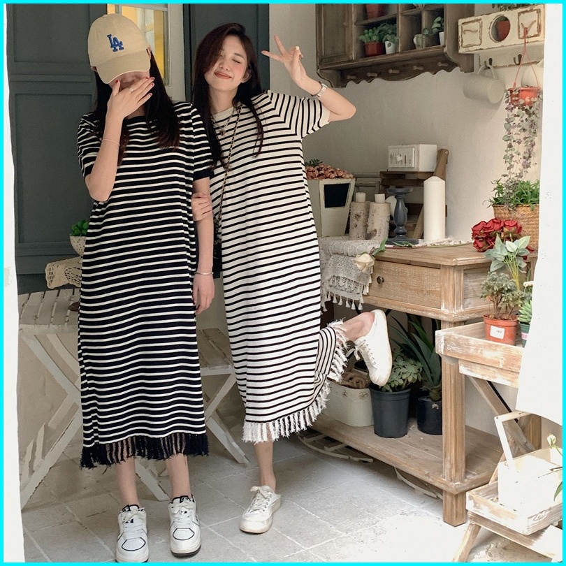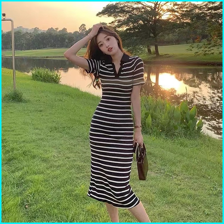 Yikoo-maxi Dress Gaun Panjang Bergaris Dengan Rajutan Korea Dres Wanita