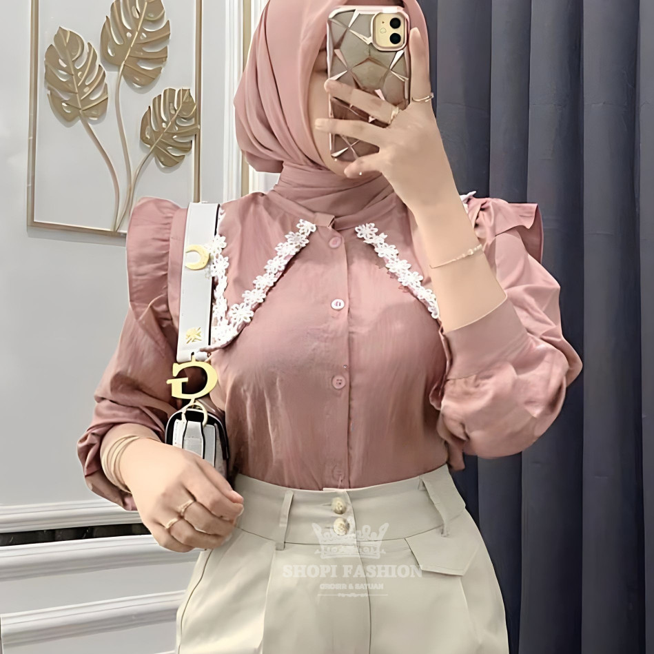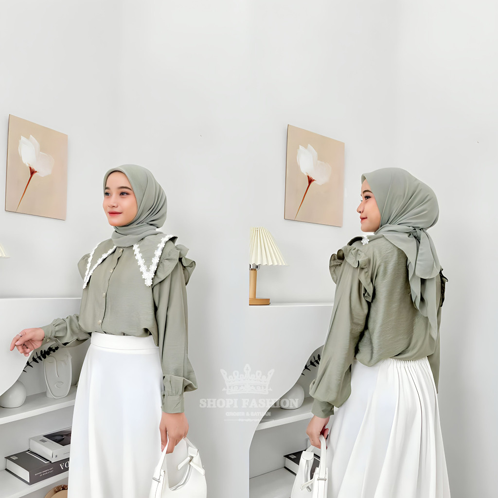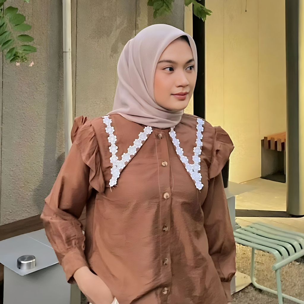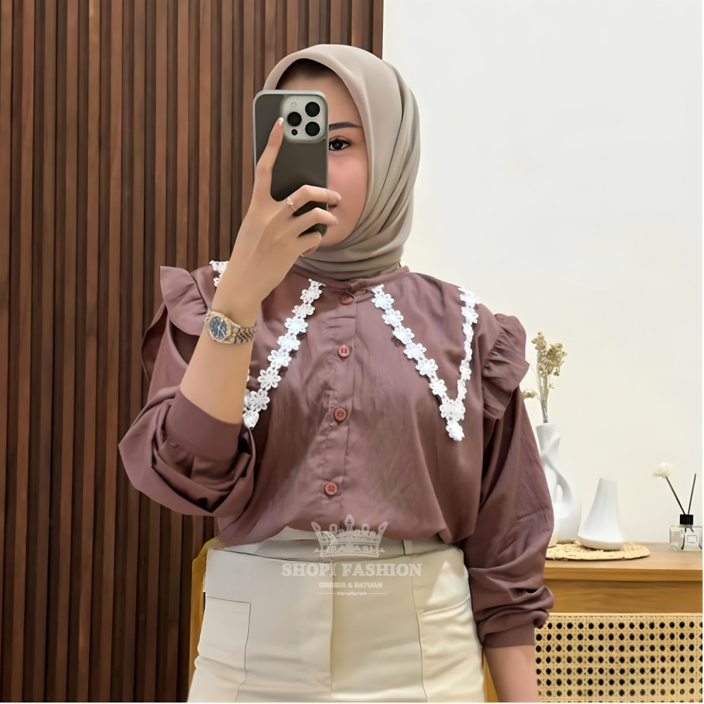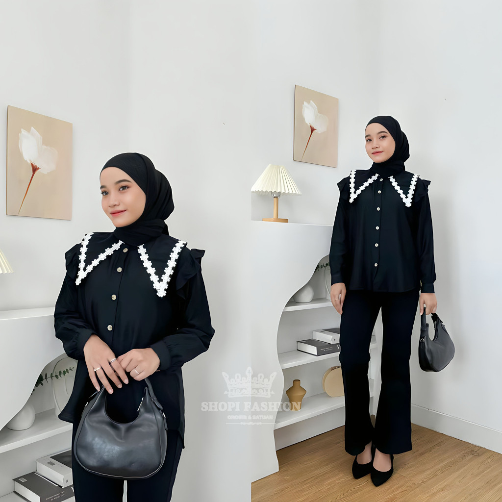 Blouse Mony Leora Kemeja Wanita Kerah Sailor Renda Lengan Panjang