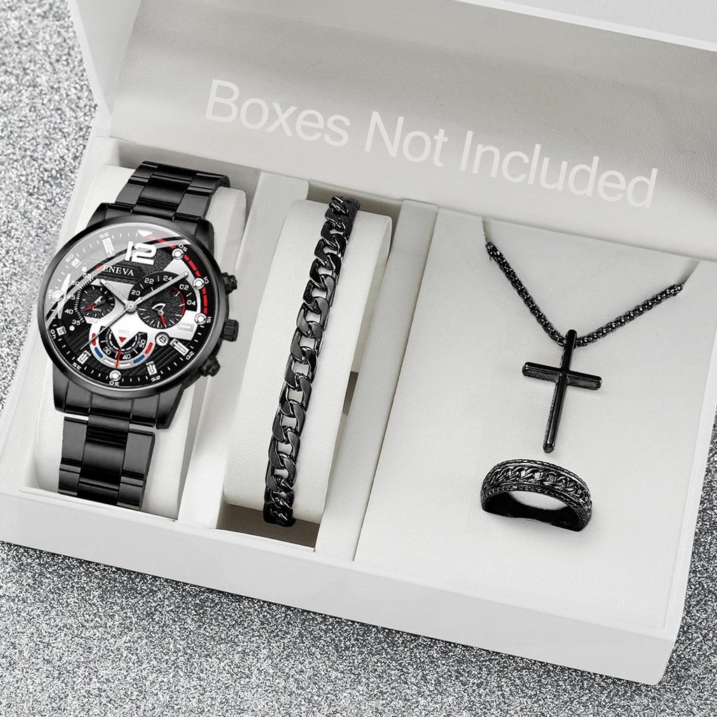 4PCS Jam Tangan Kuarsa Pria Gaya Bisnis Penunjuk Dial Besar Tali Baja Jam Tangan Mode Gelang Kalung Kalung Cincin Gratis Tanpa Kotak