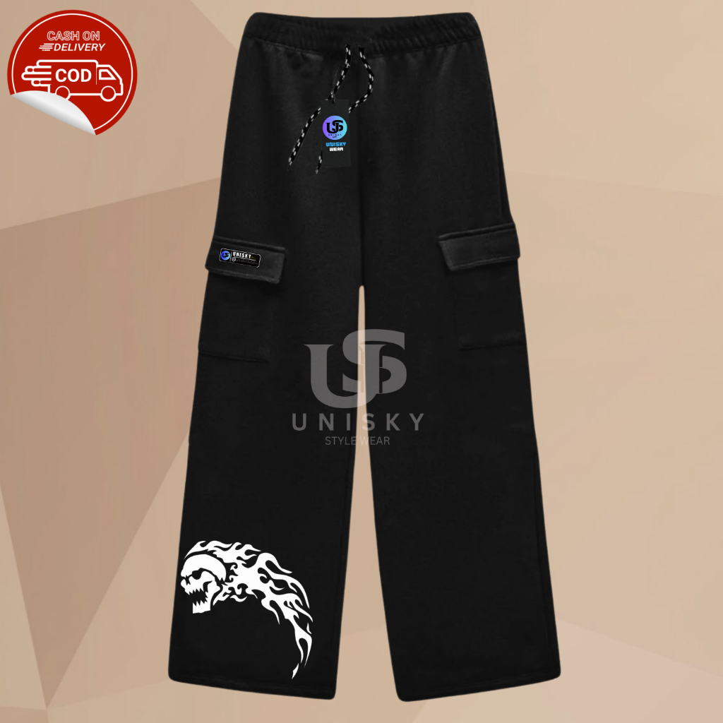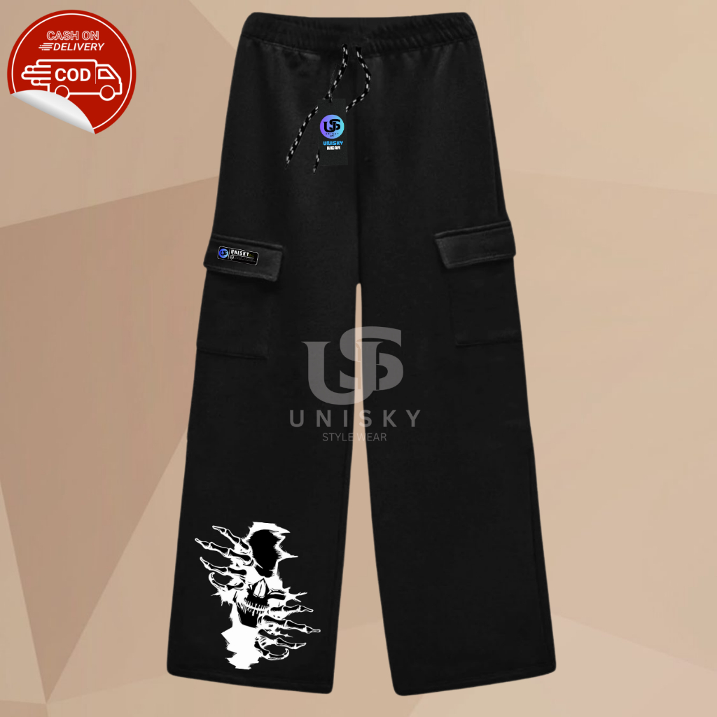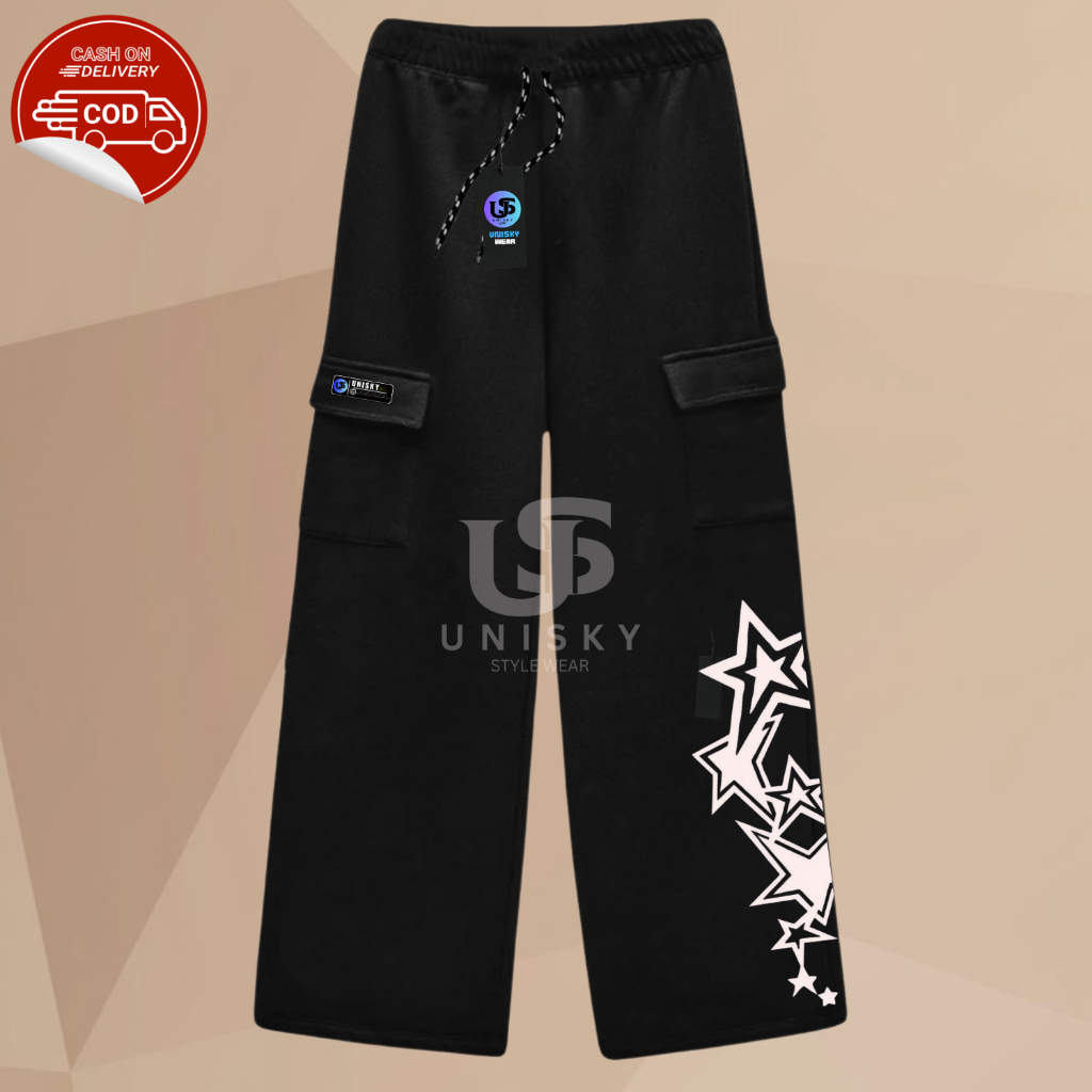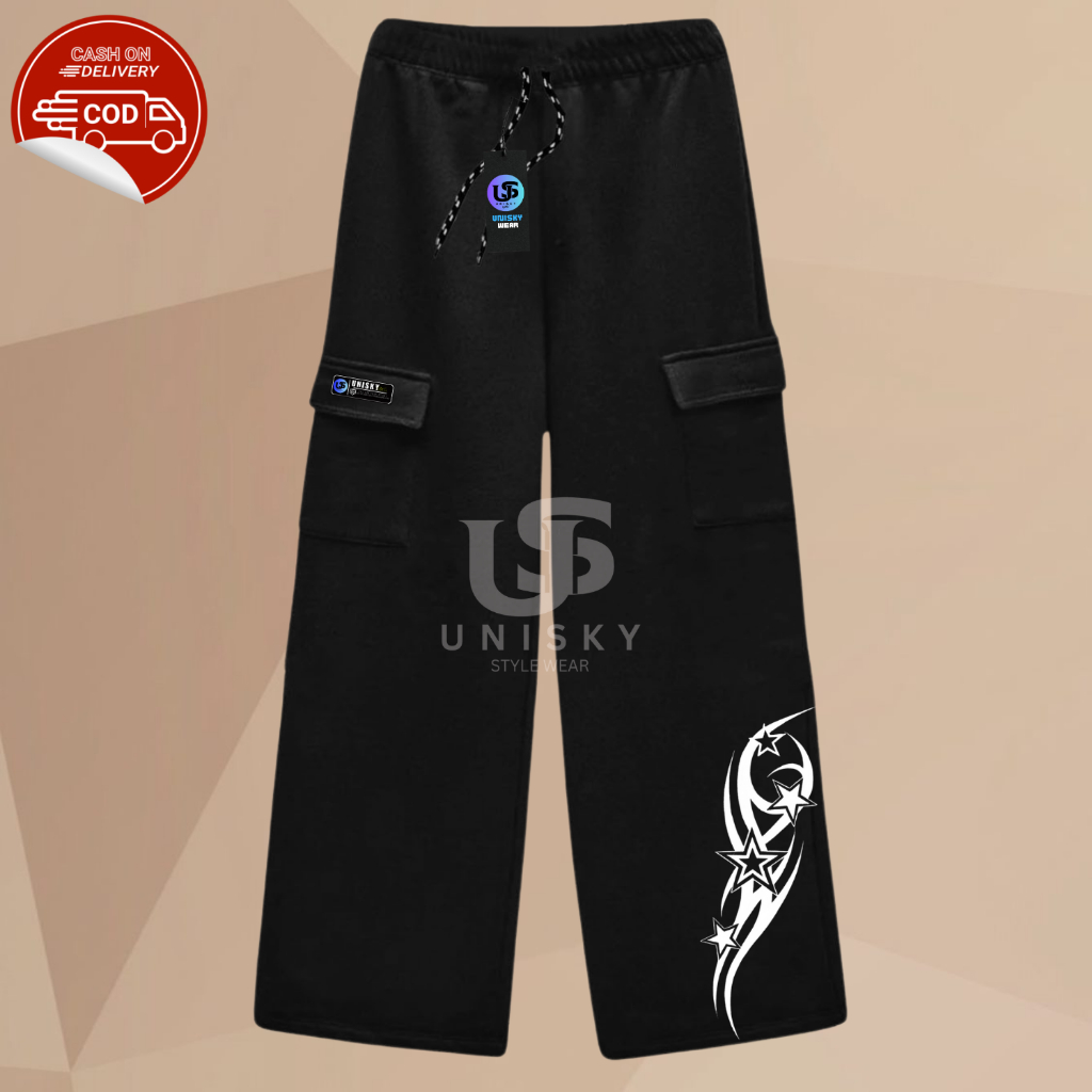 UNISKY Celana Panjang Cargo Bahan Fleece Motif Star Cargo Fleece Long Pants Celana Panjang Flecee Pria Wanita Warna Hitam Model Skena