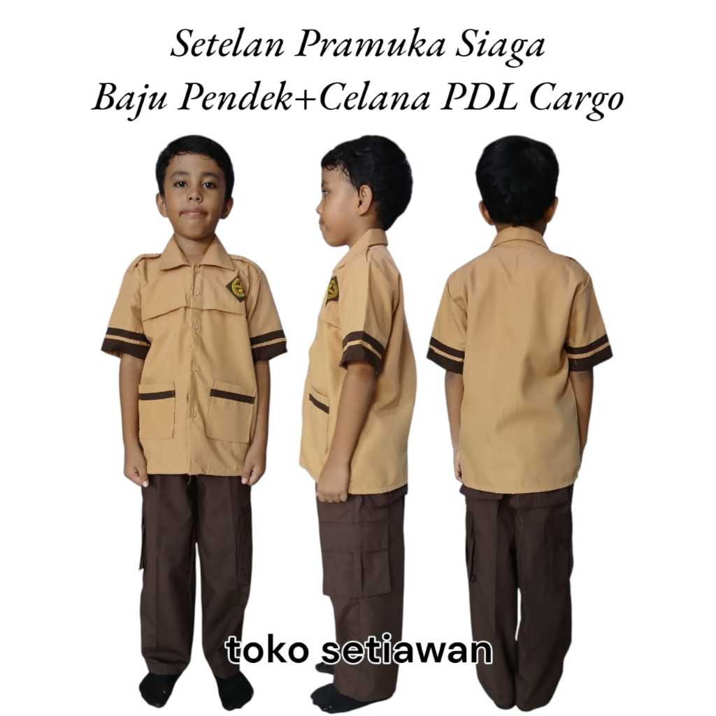 Setelan Seragam Pramuka Siaga Baju Siaga Lengan Pendek Bahan Oxford Dan Celana PDL Cargo Warna Cokelat Bahan Famatex Unt