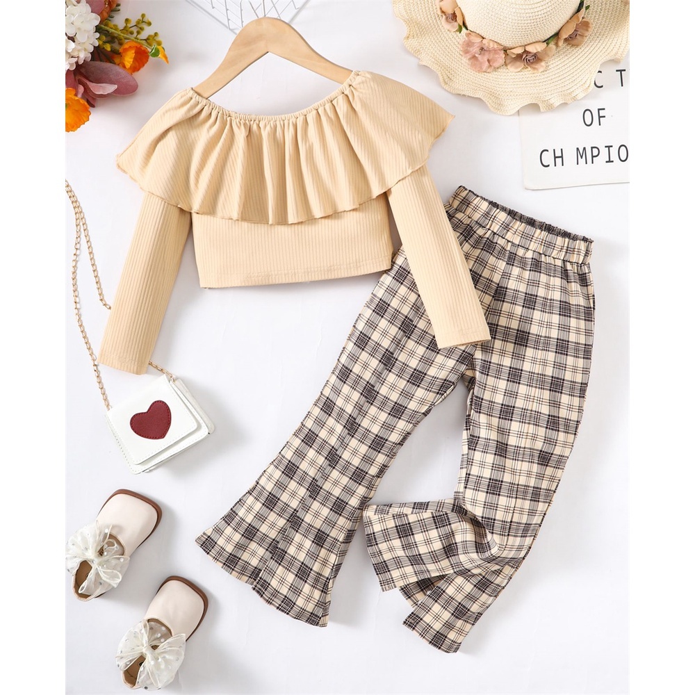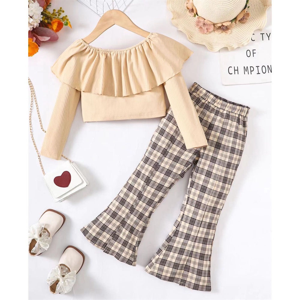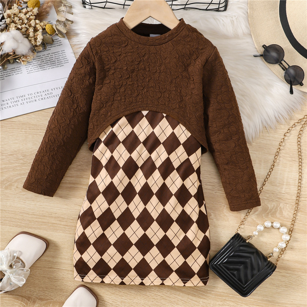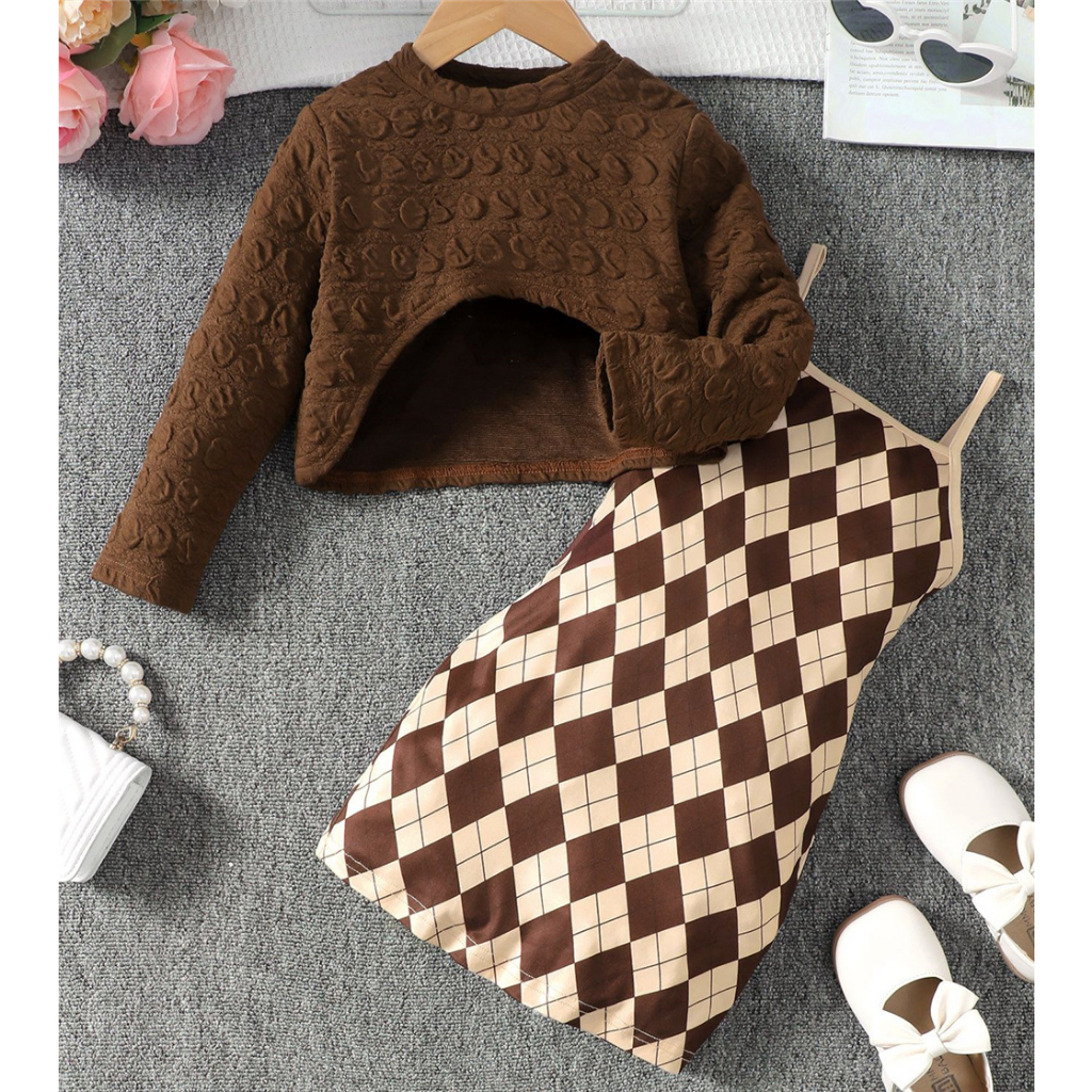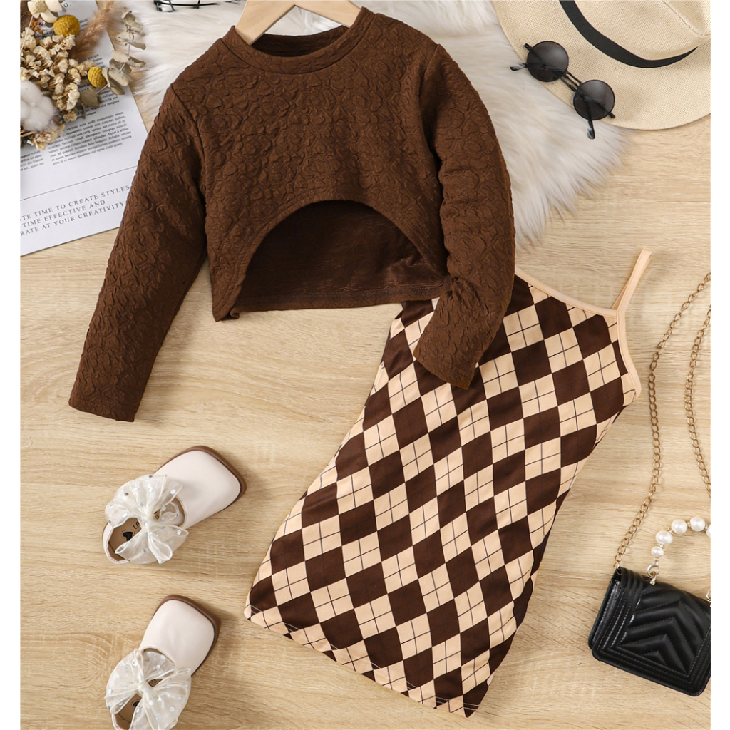 Dress Anak 1-8Years Kids Baju Baby Girl Autumn Daily Clothes Set Long Sleeve Top + Strap Plaid Dress Lovely Fashion 2PC