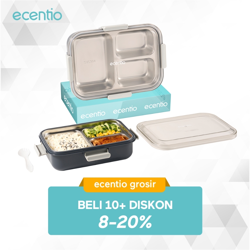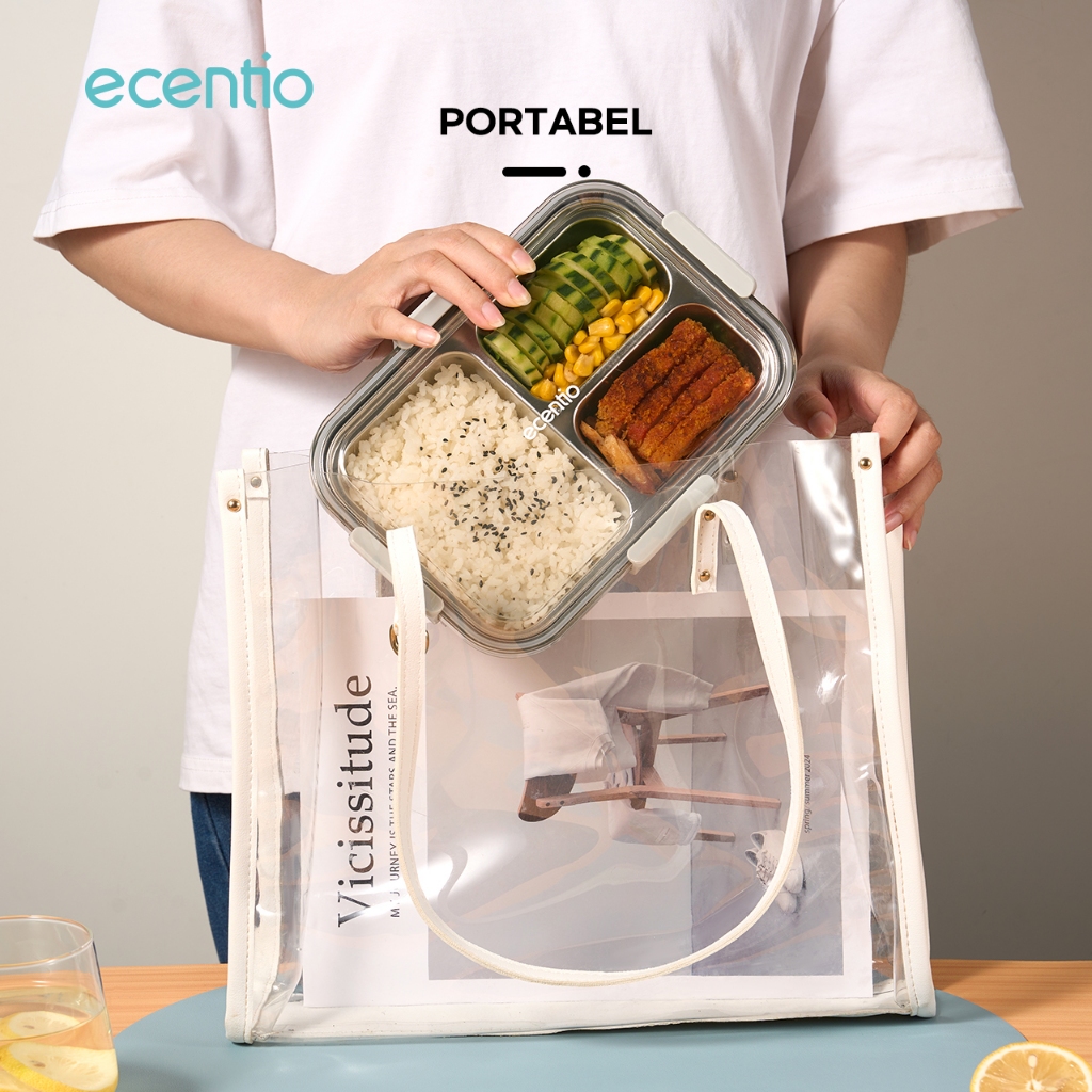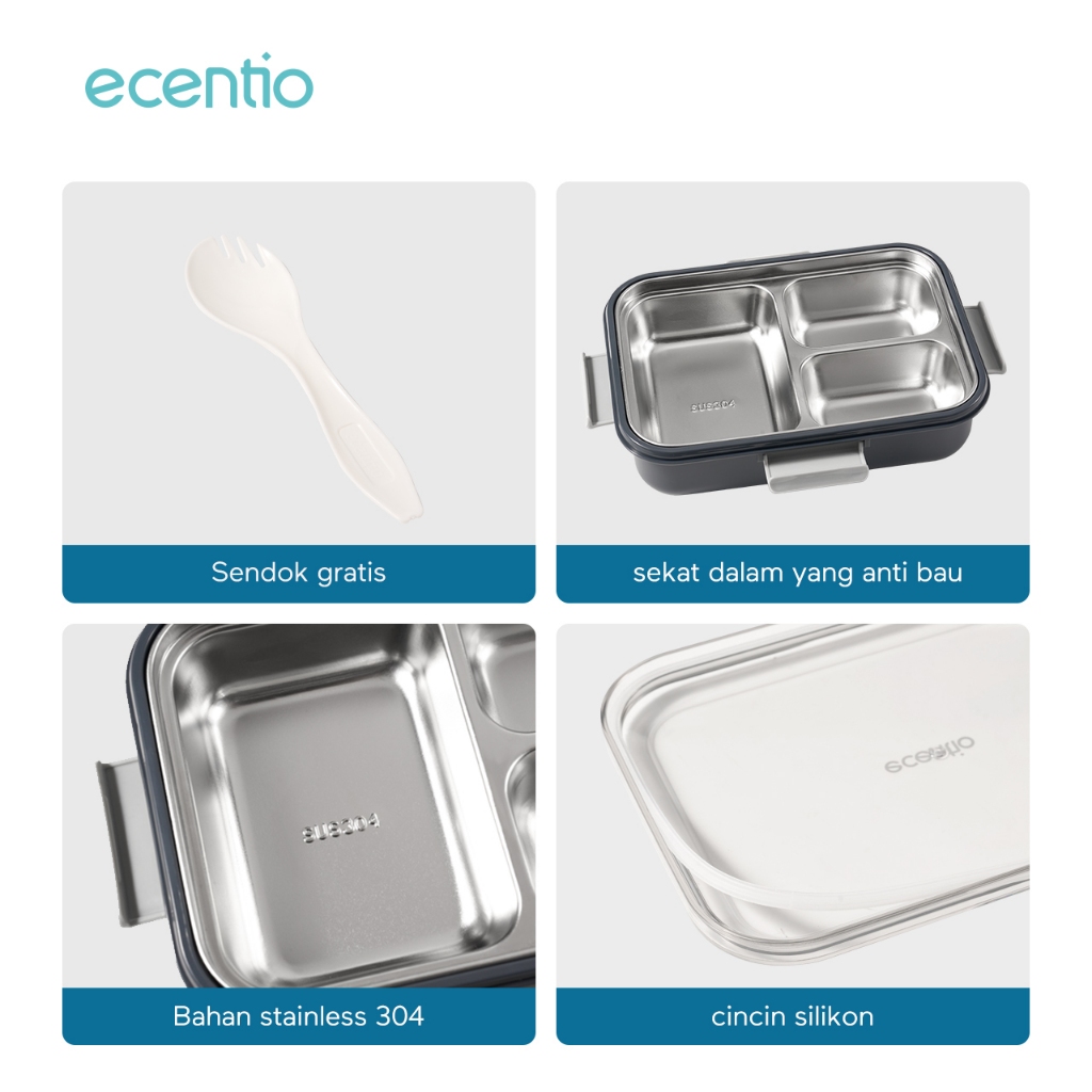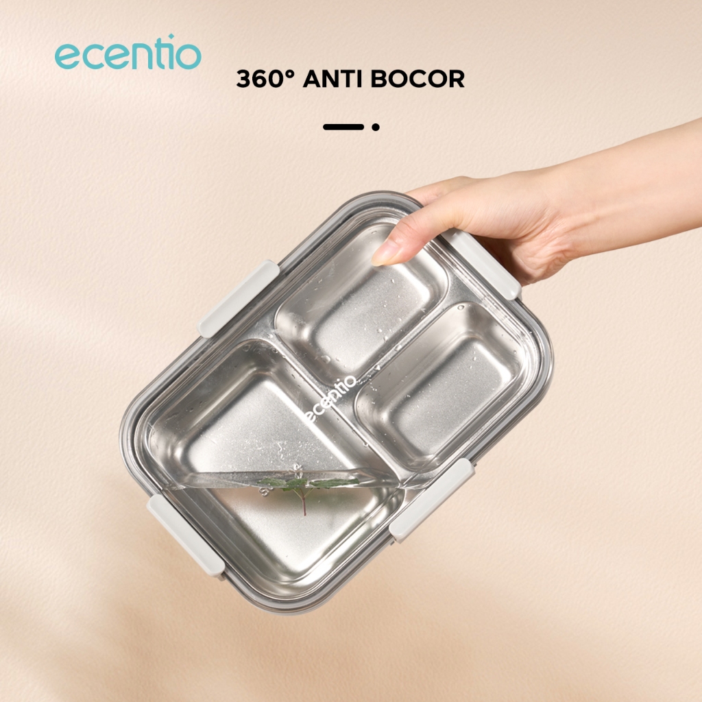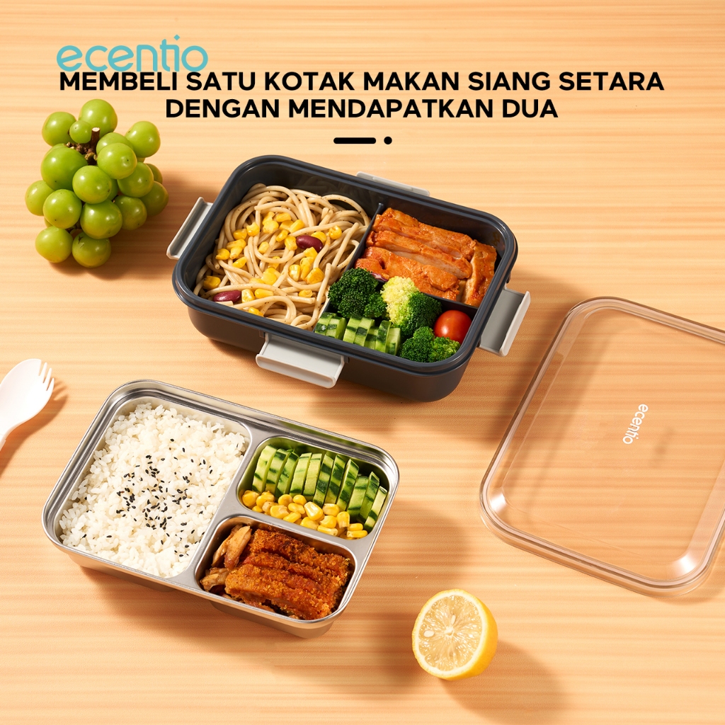 ECENTIO Kotak Makan Stainless 850ml Lunch Box 3 Grid Anti Tumpah Kotak Bekal 2 In 1 Fork And Spoon