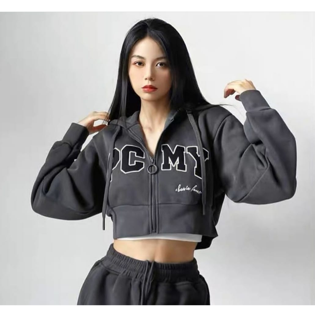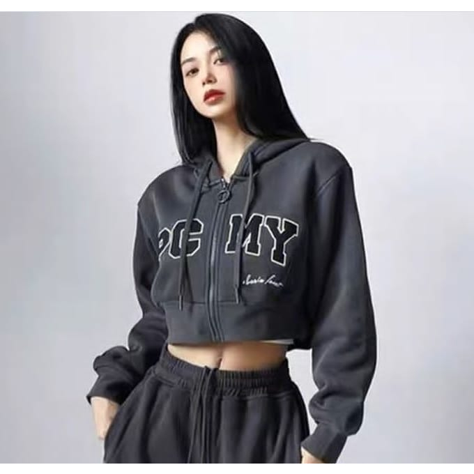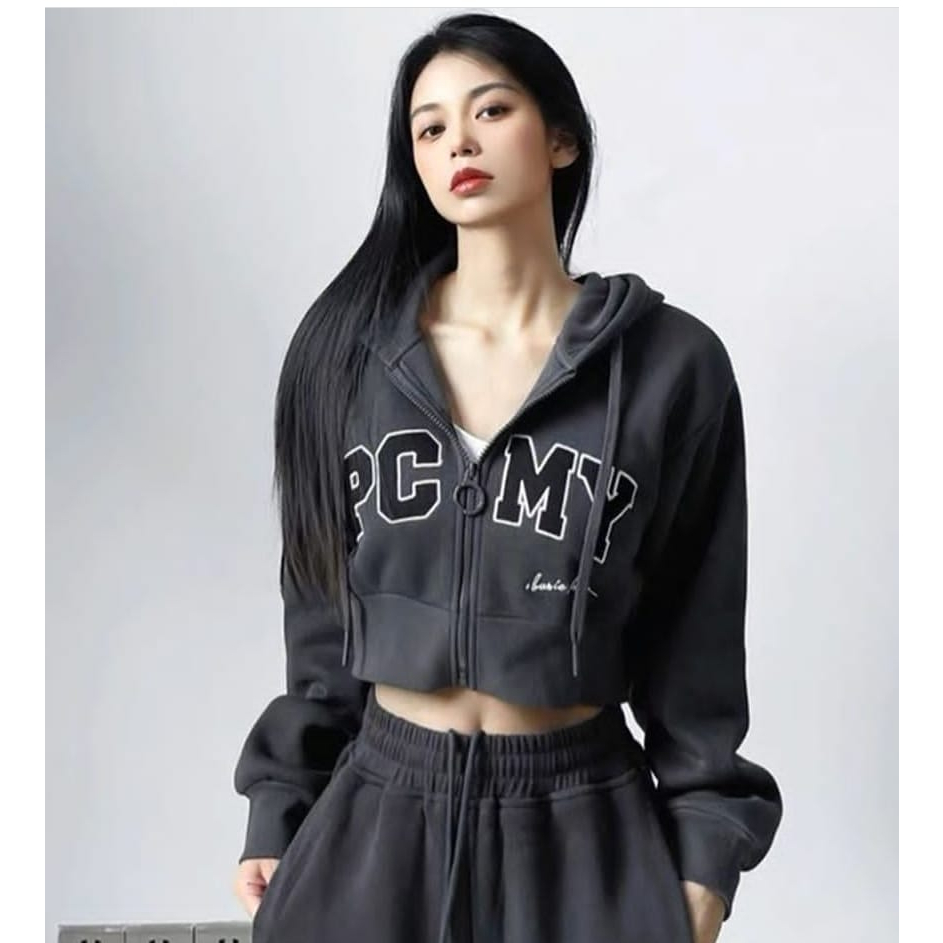 Jaket Croope PCMY Hoodie Zipper Sweater Wanita Crop Top