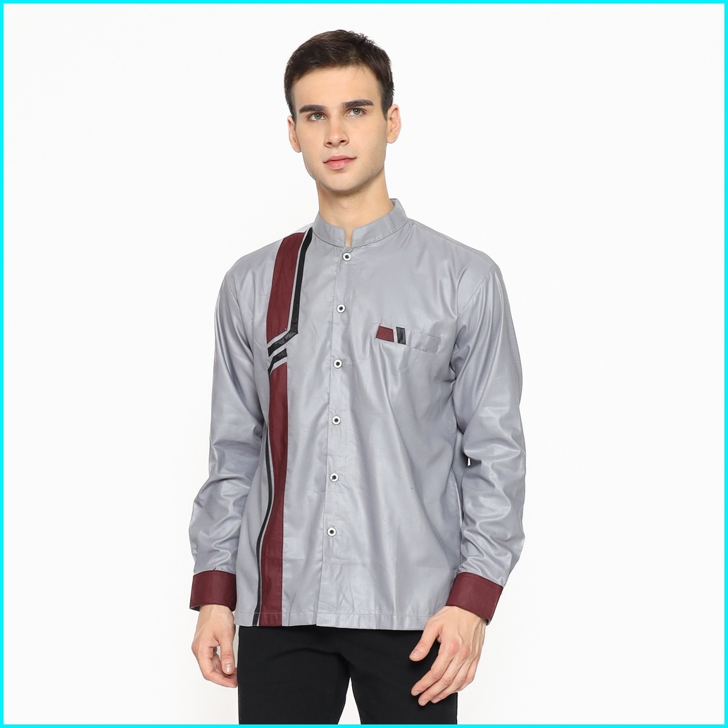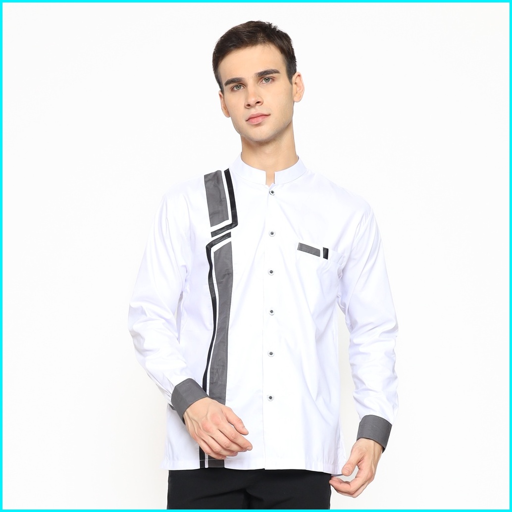 Asakhi - Baju Koko Pria Muslim Lengan Panjang Koko Hadroh Azzahir Motif Petir Warna Putih Kombinasi Abu M L Xl