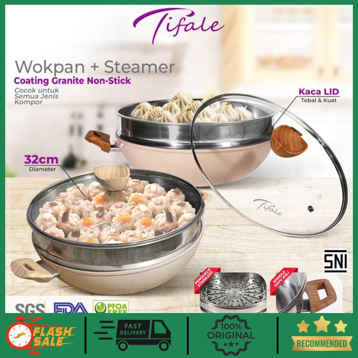 Tifale 2IN1 Wokpan Diameter 32cm Glass Lid Granite Steamer Non Stick Alat Masak Wok dengan Panci Kukus Granite