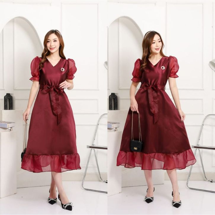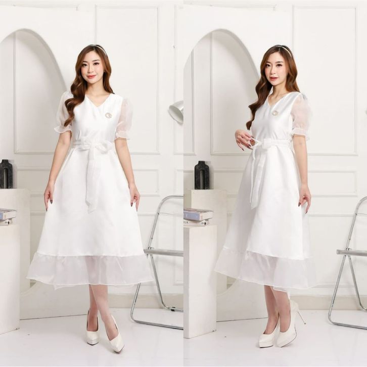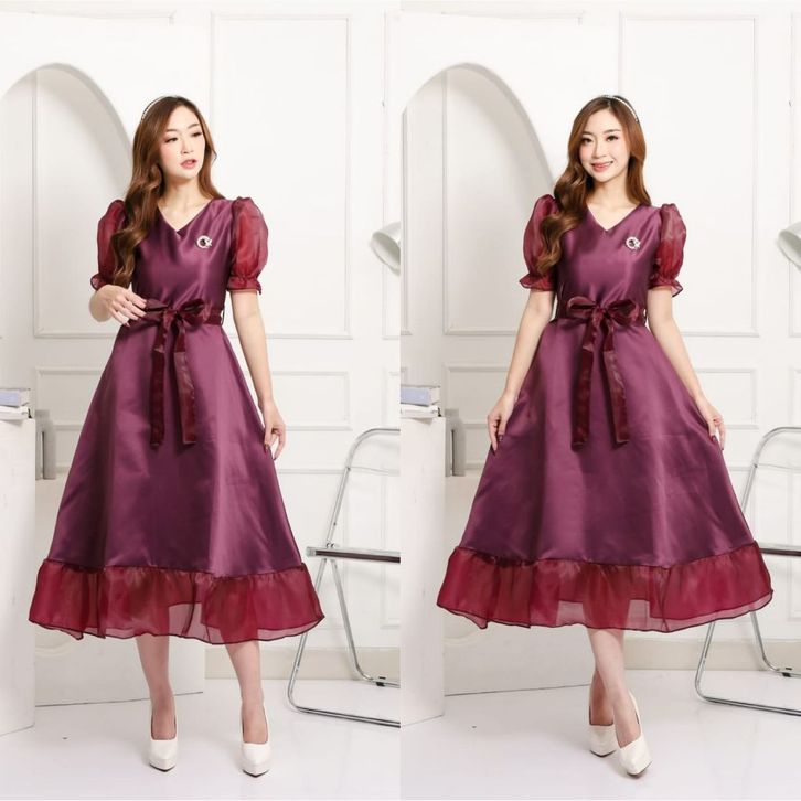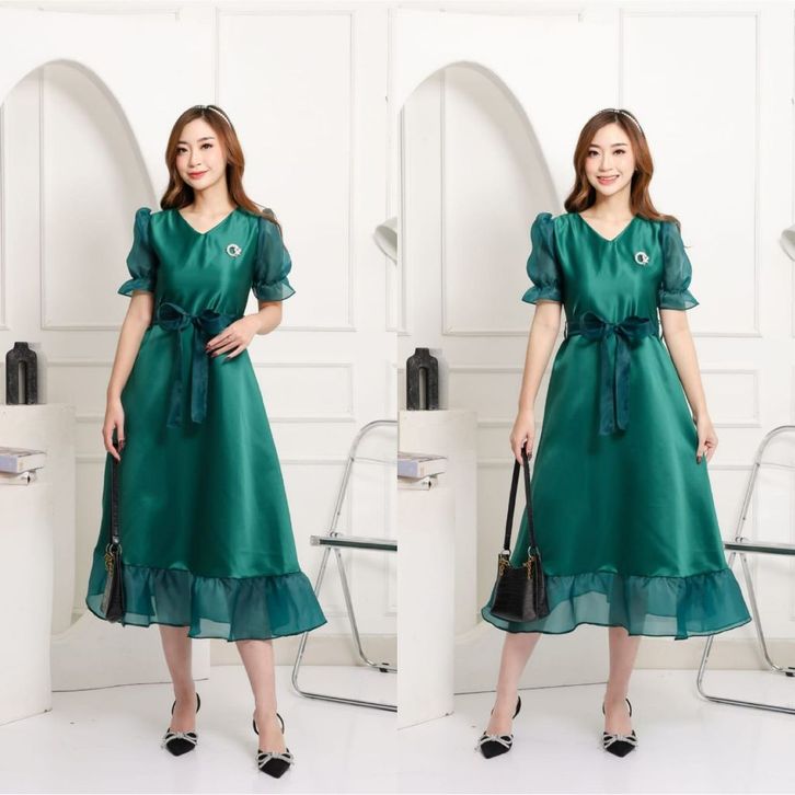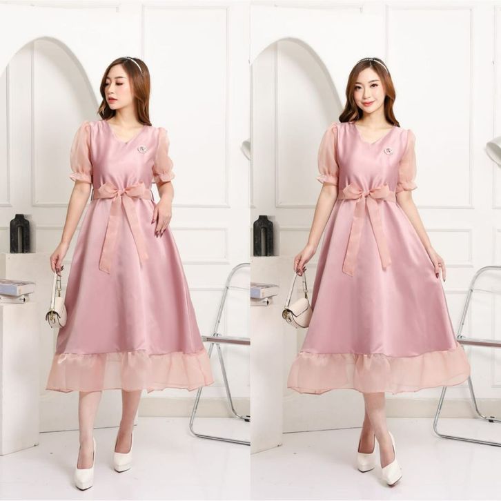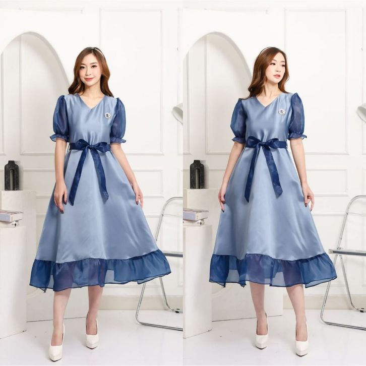 emma.butik e00308 midi dress satin mix organsa gaun formal wanita polos pesta gereja elegan formal kasual anggun simple