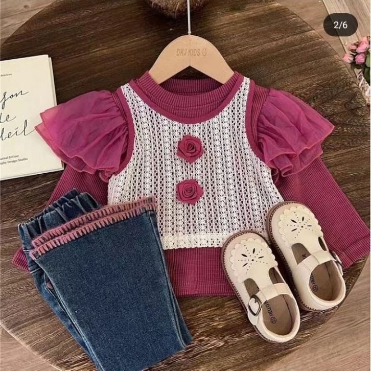 baju anak Setelan baju anak perempuan dan celana jens panjang 3in1