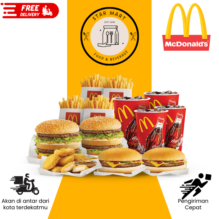 2pcs Korean Soy Garlic Wings, 6pcs Korean Soy Garlic Wings, A La Carte - McSpaghetti, Air Mineral 600MILI., Apple Pie, Ayam 1Pc, Ayam 2pcs, BUKAAN UNTUK TEMAN - FREE McFlurry feat OREO dan 1, Beef Burger, Beef Burger Deluxe, Big Mac, Cheeseburger, Cheeseburger Deluxe, Chicken Burger, Chicken Burger Deluxe, Chicken Snack Wrap™, Coca Cola®, Combo Choco Frappe, small + Cheese Stick, Combo Mango Frappe, small + Cheese Stick, Dinosaur McFlurry® Dark Choco with OREO, Dinosaur McFlurry® With Choco Balls, Double Cheeseburger, Family Time Bertiga, Family Time Bertiga (+mainan), Fanta®, Fish Burger, French Fries - Large, French Fries - medium, French Fries, small, Fruit Tea Blackcurrant 200MILI., Fruit Tea Blewah, Fruit Tea Lemon, HEMAT - 2 Ayam Krispy McD + 2 Rice + 2 Fruitea Lem, HEMAT - 2 Paket HeBat Korean Soy Garlic Wings, HEMAT - Ayam Krispy McD + 4 McNuggets + Rice + Fre, HEMAT - Ayam Krispy McD + Beefburger + Rice + Fren, Happy Meal® Ayam, Happy Meal® Beef Burger, Happy Meal® McNuggets® 4Pcs, Hello Kitty Plush Bag Tag + McFlurry feat Oreo, Hello Kitty Plush Bag Tag + PaNas 1, Hot Café Latte, Hot Cappucino, Hot Coffee, Hot Flat White, Hot Long Black, Hotcake Sundae Choco, Hotcake Sundae Strawberry, Ice coffe jelly float, Iced Café Latte, Iced Cappucino, Iced Coffee, Iced Lychee Tea, Jasuke, Jasuke feat. OREO, MILO, small, McChicken Burger, McFloat Coke, McFloat Fanta, McNuggets® 4pcs, McNuggets® 6pcs - Paket Medium with Fries, McNuggets® 9pcs, McSpicy Chicken Burger, Mcflurry (req rasa di chat), Minecraft Movie Meal - PaNas 2, Minecraft Movie Meal - Paket Hemat Double Cheesebu, NASI UDUK, PAKET BIG ORDER (25 BOX), PAKET HANTARAN MCD, PAKET KENYANG, PAKET NGEMIL SPECIAL, PAMER 5 MIX / CRIPSY / SPICY PAKET +NASI DAN MINUM, PAMER 5 MIX / CRSPY / SPICY ALA CARTE, PAMER 7 MIX / CRISPY / SPICY PAKET +NASI DAN MINUM, PAMER 7 MIX / CRSPY / SPICY ALA CARTE, PROMO - PaNas 2 Lrg Ayam McD Krispy Free McFlurry, PROMO - Paket Hemat Lrg 2 Ayam McD Krispy with Fri, PROMO - Paket Hemat Lrg 6 PCS McNuggets Free McFlu, PROMO - Paket Hemat Lrg Beef Burger Deluxe Free Mc, PROMO - Paket Hemat Lrg Big Mac Free McFlurry feat, PROMO - Paket Hemat Lrg Cheeseburger Deluxe Free M, PROMO - Paket Hemat Lrg Cheeseburger Free McFlurry, PROMO - Paket Hemat Lrg Chicken Burger Deluxe Free, PROMO - Paket Hemat Lrg Double Cheeseburger Free M, PROMO - Paket Hemat Lrg Fish Filet Burger Free McF, PROMO - Paket Hemat Lrg McChicken Burger Free McFl, PROMO - Paket Hemat Lrg McSpicy Chicken Burger Fre, PROMO - Paket Hemat Lrg Triple Cheeseburger Free M, PaMer 5 Ayam Lengkuas McD Sambal Bajak - besar, PaMer 7 Ayam Lengkuas McD Sambal Bajak - besar, PaNas 2 Ayam Lengkuas McD Sambal Bajak, PaNas 2 with Fries - Paket Hemat Besar, PaNas 2 with Fries - Paket Hemat Medium, PaNas 2 with Fries Ayam Lengkuas McD Sambal Bajak, PaNas 2 with Rice - besar, PaNas 2 with Rice - medium, PaNas Korean Soy Garlic Wings, PaNas Special Gratis McFlurry feat. OREO, PaNas Spesial - besar, PaNas Spesial - medium, PaNas Spesial Ayam Lengkuas McD Sambal Bajak, Paket Ber 4 BukBer, FREE 4pcs McFlurry feat. OREO, Paket Ber 4 SAHUR, FREE 4 Apple Pie, Paket Ber 6 BukBer : FREE 6pcs McFlurry feat. OREO, Paket Ber 6 SAHUR, FREE 6 Apple Pie, Paket HeBat - Beef Burger Deluxe, Paket HeBat - Chicken Burger Deluxe, Paket HeBat - Korean Soy Garlic Wings, Paket HeBat McSpaghetti, Paket Hemat Large - Beef Burger Deluxe, Paket Hemat Large - Big Mac, Paket Hemat Large - Cheeseburger, Paket Hemat Large - Cheeseburger Deluxe, Paket Hemat Large - Chicken Burger Deluxe, Paket Hemat Large - Double Cheeseburger, Paket Hemat Large - Fish Burger, Paket Hemat Large - McChicken Burger, Paket Hemat Large - McSpicy Chicken Burger, Paket Hemat Large - Triple Cheeseburger, Paket Hemat Large Gratis McFlurry feat. OREO, Paket Hemat Medium - Beef Burger Deluxe, Paket Hemat Medium - Big Mac, Paket Hemat Medium - Cheeseburger, Paket Hemat Medium - Cheeseburger Deluxe, Paket Hemat Medium - Chicken Burger Deluxe, Paket Hemat Medium - Double Cheeseburger, Paket Hemat Medium - Fish Burger, Paket Hemat Medium - McChicken Burger, Paket Hemat Medium - McSpicy Chicken Burger, Paket Hemat Medium - Triple Cheeseburger, Paket Hemat Medium McSpicy, Paket Hemat with McFlavor Set + Color Changing Tum, Paket Keluarga Seru Dengan Mainan, Paket Keluarga Seru Tanpa Mainan, Paket Large with Fries + Color Changing Tumbler, Paket Large with Fries - McNuggets® 6pcs, Paket Manis, Paket Ulang Tahun - Ayam McD Krispy, Paket Ulang Tahun - Beef Burger Deluxe, Paket Ulang Tahun - McSpaghetti + Ayam McD Krispy, Spicy Chicken Bites, Sprite®, Sweet Corn, Sweet Surprise Gift, Teh Panas, Tehbotol Sosro® Kotak 250MILI., Tehbotol Sosro® Tawar 350MILI, Triple Cheeseburger, choco sundae, paket double cheese burger+jelly float, strawberry sundae, vanilla sundae