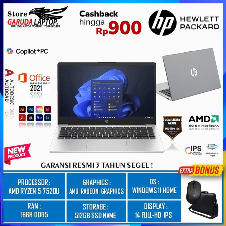 HP 245 G10 Ryzen 5 7520U Radeon 16GB RAM 512GB SSD Windows 11 Garansi 1 Tahun Laptop Gaming