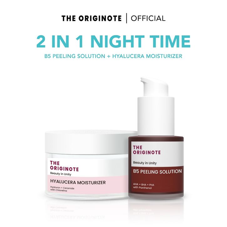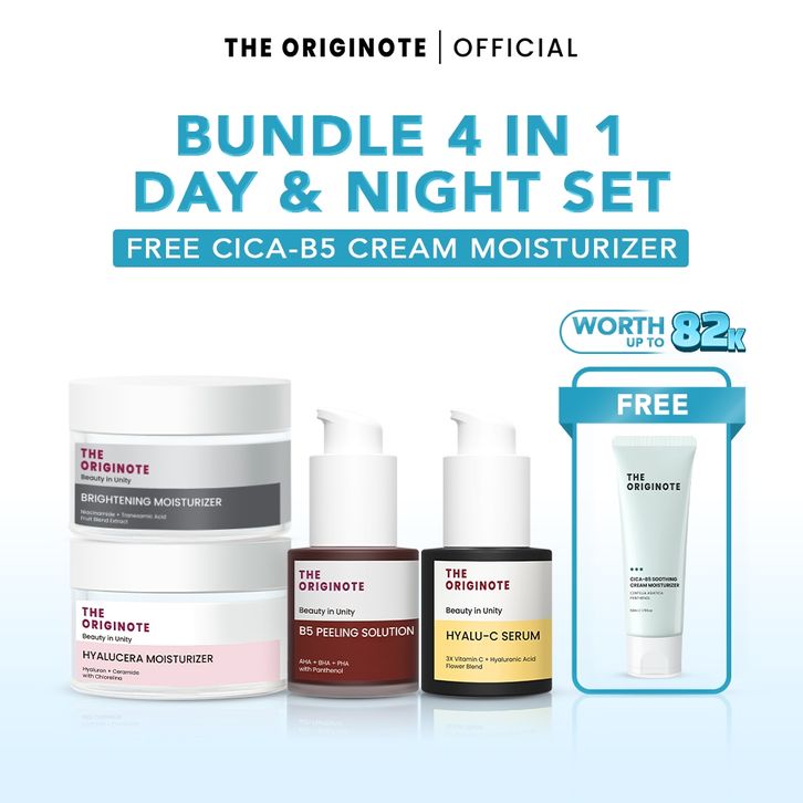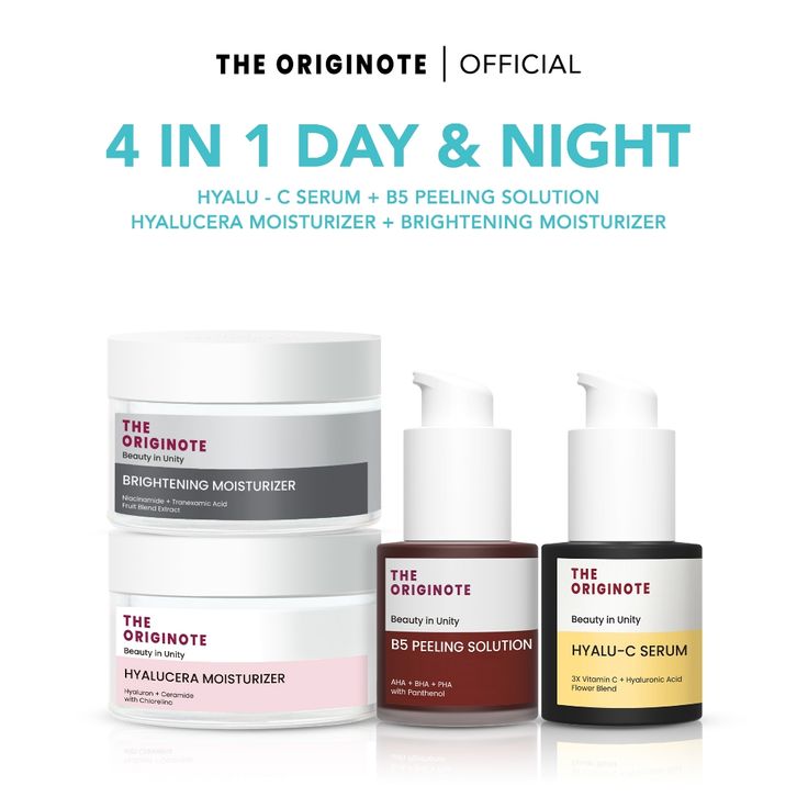 The Originote Bundle 4in1 Day & Night Set - Paket Skincare Moisturizer, Hyalu-C Serum, Peeling Mencerahkan & Menghidrasi