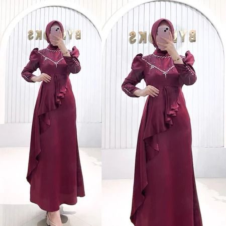 kharisma rashiqa dress gamis baju gaun satin silk tile mermress polos burgundy duyung bridesmaid kondangan wisuda