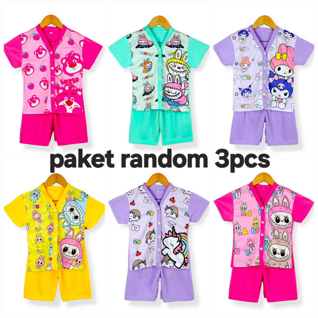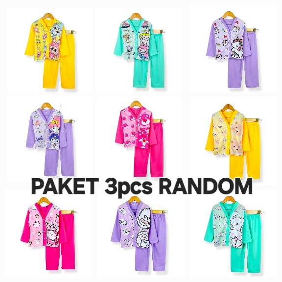 Paket grosir 3pcs setelan piyama kaos anak perempuan motif printing lengan panjang