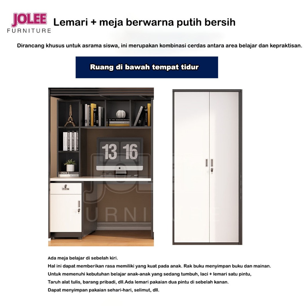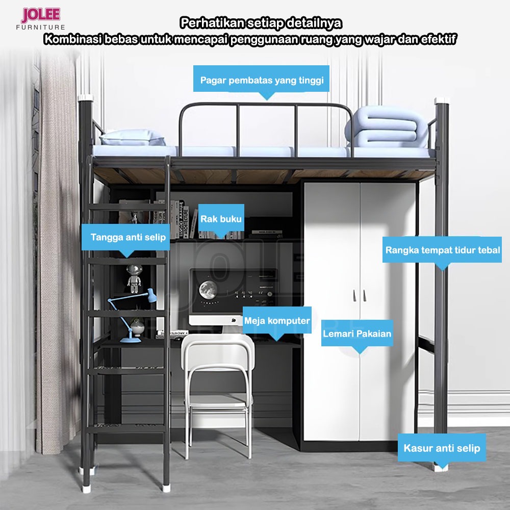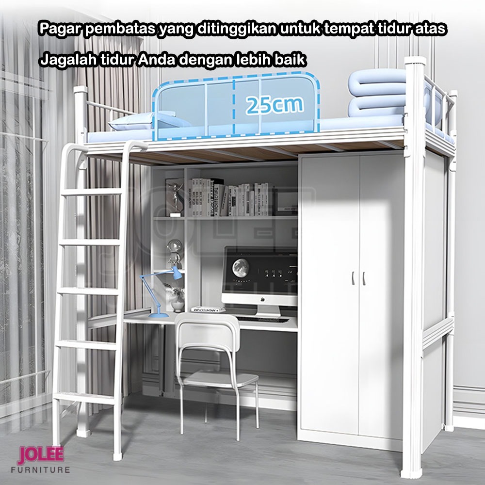 Tempat tidur susun besi, susun atas sebagai tempat tidur, susun bawah sebagai lemari+rak buku+meja
