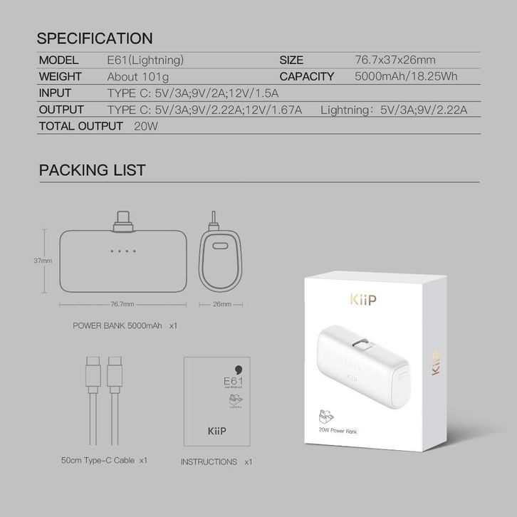 TERLARIS POWER BANK - KiiP E61 Mini Power Bank Fast Charging PD 20W Type-C Lightning 5000mAh