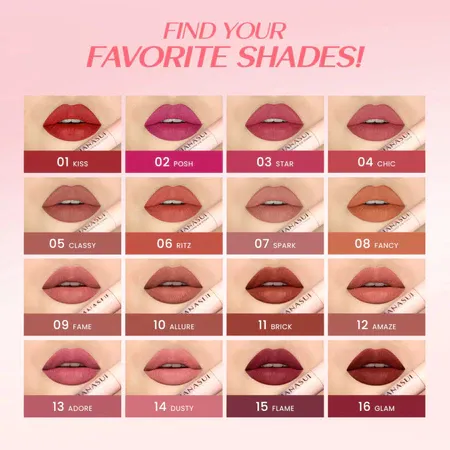 01 KISS, 02 POSH, 03 STAR, 04 CHIC, 05 CLASSY, 06 RITZ, 07 SPARK, 08 FANCY, 09 FAME, 10 ALLURE, 12 AMAZE, 13 ADORE, 14 DUSTY, 15 FLAME, 01. FOREST BERRY, 02. BROWN SUGAR, 03.SALTED CARAMEL, 04. PINK LAVA, 05. CREAMY PEACH, 06. HAZELNUT LATTE, 01 CHERRY, 02 PEACHE, 03 RUBY, 04 SWEET, 05 CORAL, 06 BLOODY, 07 COPPER, 08 ROSY, 09 DREAMY, 01 MATCHALICIOUS, 02 MATCHAMALLOW, 03 MATCHACIANO, 04 MATCHALOVER, 05 MATCHABLEND, 06 MATCHACHOCO, 01 NOT TODAY., 02 YES HONEY., 03 THANK YOU., 04 BLESS ME., 05 SPEECHLES., 06 STAY COOL., SUPERSTAR - 101, SWAY - 103, NOONA - 105, POP - 107, CINNAMON - 110, PEONY - 111, TROPICAL - 113, SANDSTONE - 115, JAZZY - 117, RETRO - 118