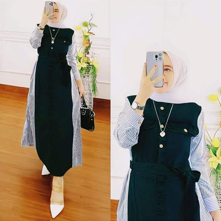 Gamis Jeans kombinasi Salur / Gamis Jeans wanita / Gamis Muslim wanita /Cel Dress Maxy Jeans