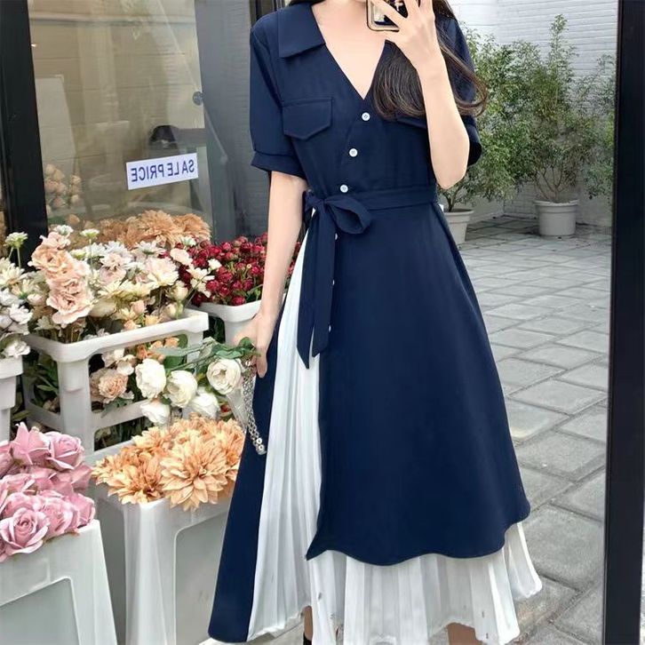 Dres Korea Baru Pinggang Ramping Gaun Ramping Warna Kontras Jahitan Dress Panjang Gaya Korea