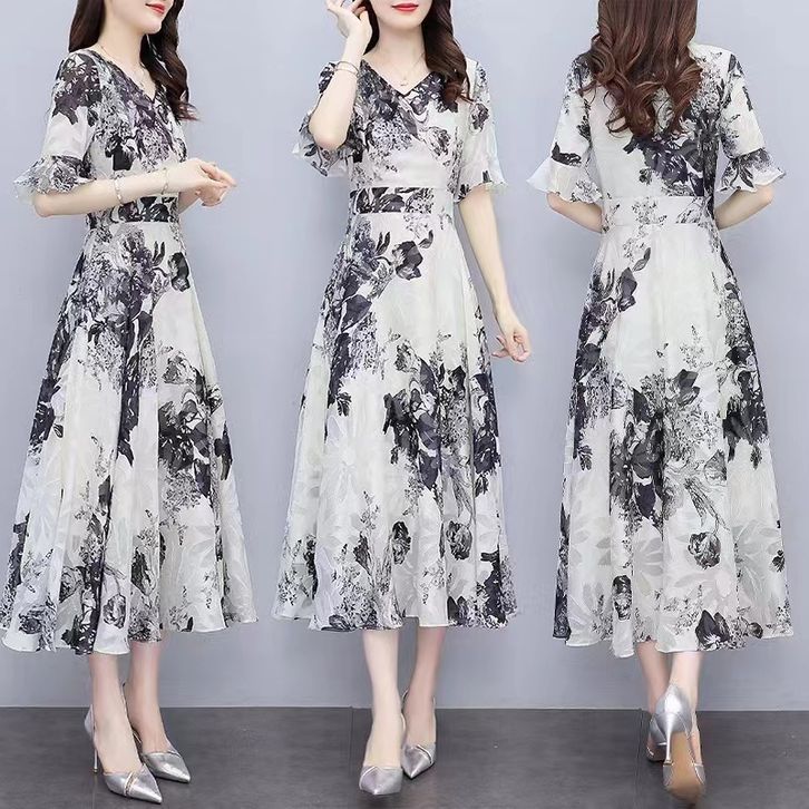 Dres Korea Fan 2025 Gaun Panjang Bunga Leher V-Sifon Sifon Korea Baru/Long Dress Korea