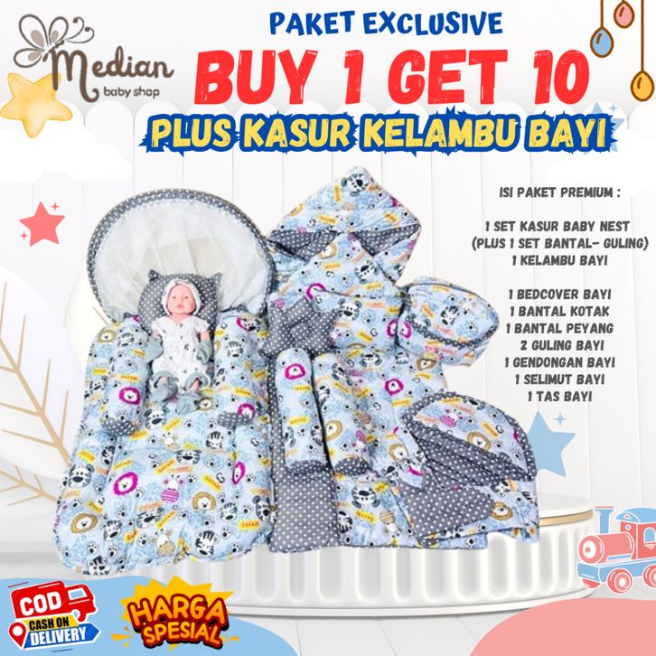 PAKET EXCLUSIVE BUY 1 GET 10 KASUR KELAMBU BAYI/ BEDCOVER/ SELIMUT TOPI/GENDONGAN SAMPING/TAS BAYI