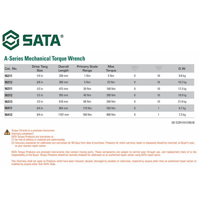 SATA TORSI 96312 1/2" DR A-SERIES MECHANICAL TORQUE WRENCH 40-200Nm SATA