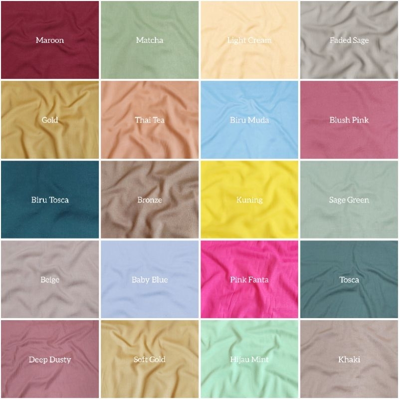 Hitam, Pink, Coklat Susu, Biru, Broken White, Merah, Kuning Glossy, Apricot, Oren Bata, Coklat Cream, Grey, Hijau, Hijau Tua, Deep Dusty, Cream, Dusty Blue, Tosca Muda, Kopi, Abu Kebiruan, Navy, Abu Muda, Taro, Oren Mustard, Warm Grey, Lavender, Moss Green, Fuschia, Pink Muda, Ungu Tua, Putih, Army Tua, Biru Mint, Hijau Botol Tua, Hijau Botol, Dusty Rose, Moca, Salem, Maroon, Matcha, Blush Pink, Gold, Khaki, Biru Tosca, Beige, Pink Fanta, Faded Sage, Baby Blue, Hijau Mint, Tosca, Thai Tea, Bronze, Soft Gold, Kuning, Dusty Pink, Burgundy
