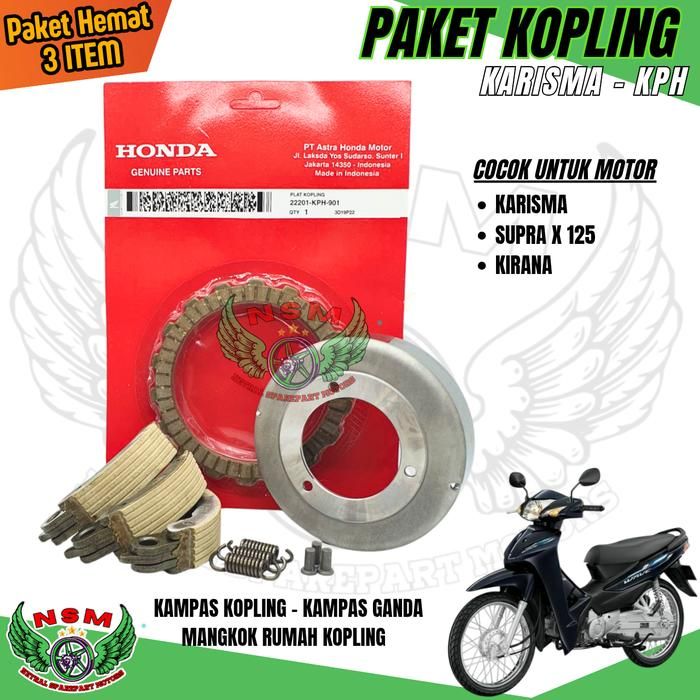 Paket Kopling 5 item kph KarismaSupra x 125 / Paket Kampas Kopling+Mangkok Ganda+Kampas Ganda+Rantai Keteng+Karet Ganda