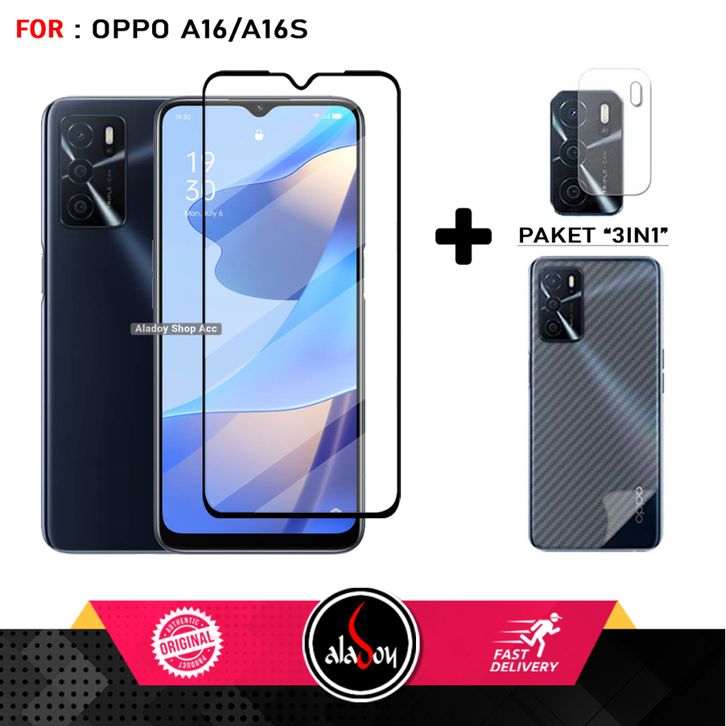 Paket 3in1 Tempered Glass Anti Static Op po A16 / A16S Free Tempered Glass Camera dan Skin Carbon