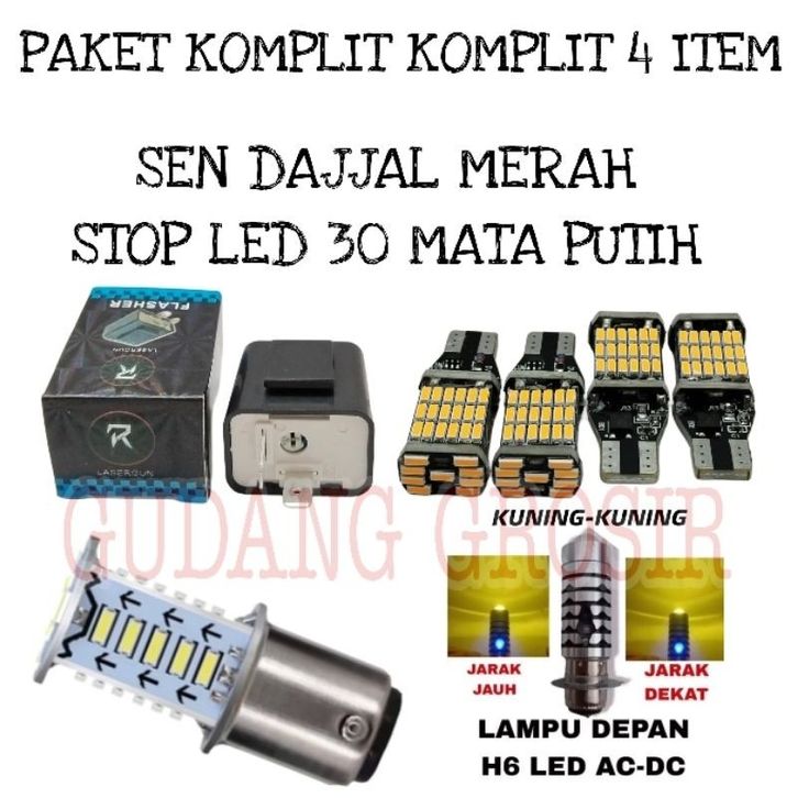 PROMO PAKET 4 ITEM LAMPU DEPAN H6 KUNING-KUNING+SEN DAJJAL+FLASER SEN+STOP LED 30 MATA BEAT,VARIO,MX,FAZIO,MEGA PRO,RX