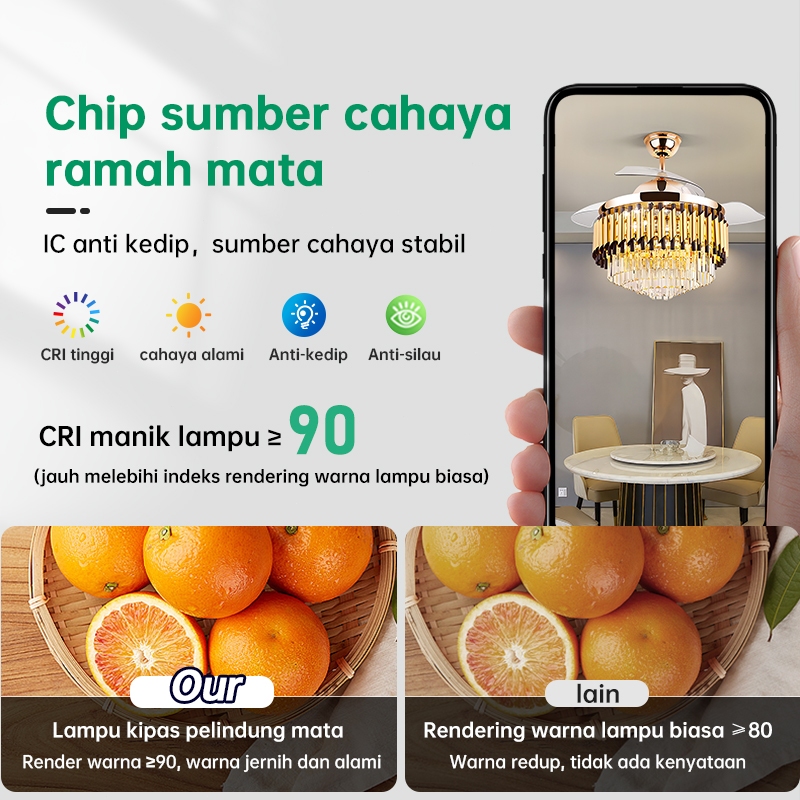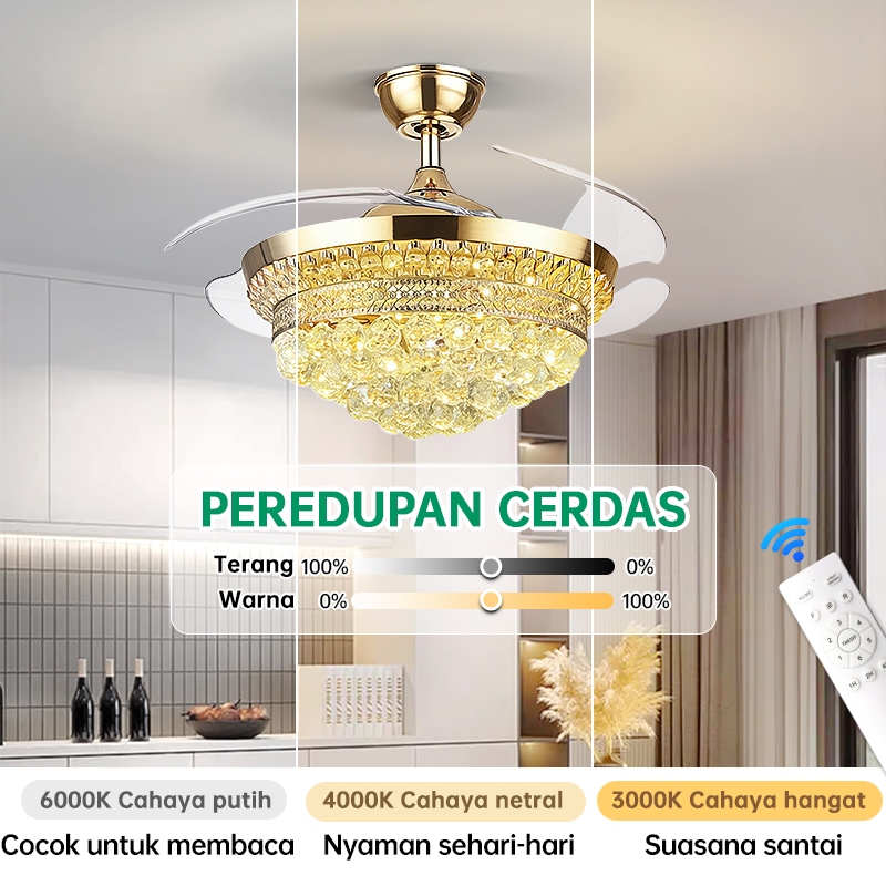 FlaLio Lampu Gantung Kristal Kipas Angin Gantung Plafon 42 Inch Remote 3 Warna 6 Kecepatan 72 W Lampu Gantung Ruang Lamp
