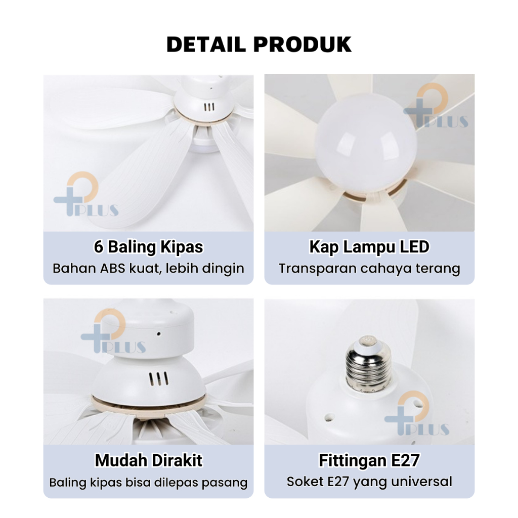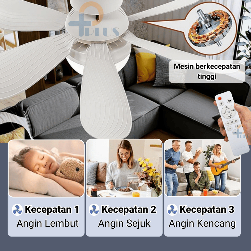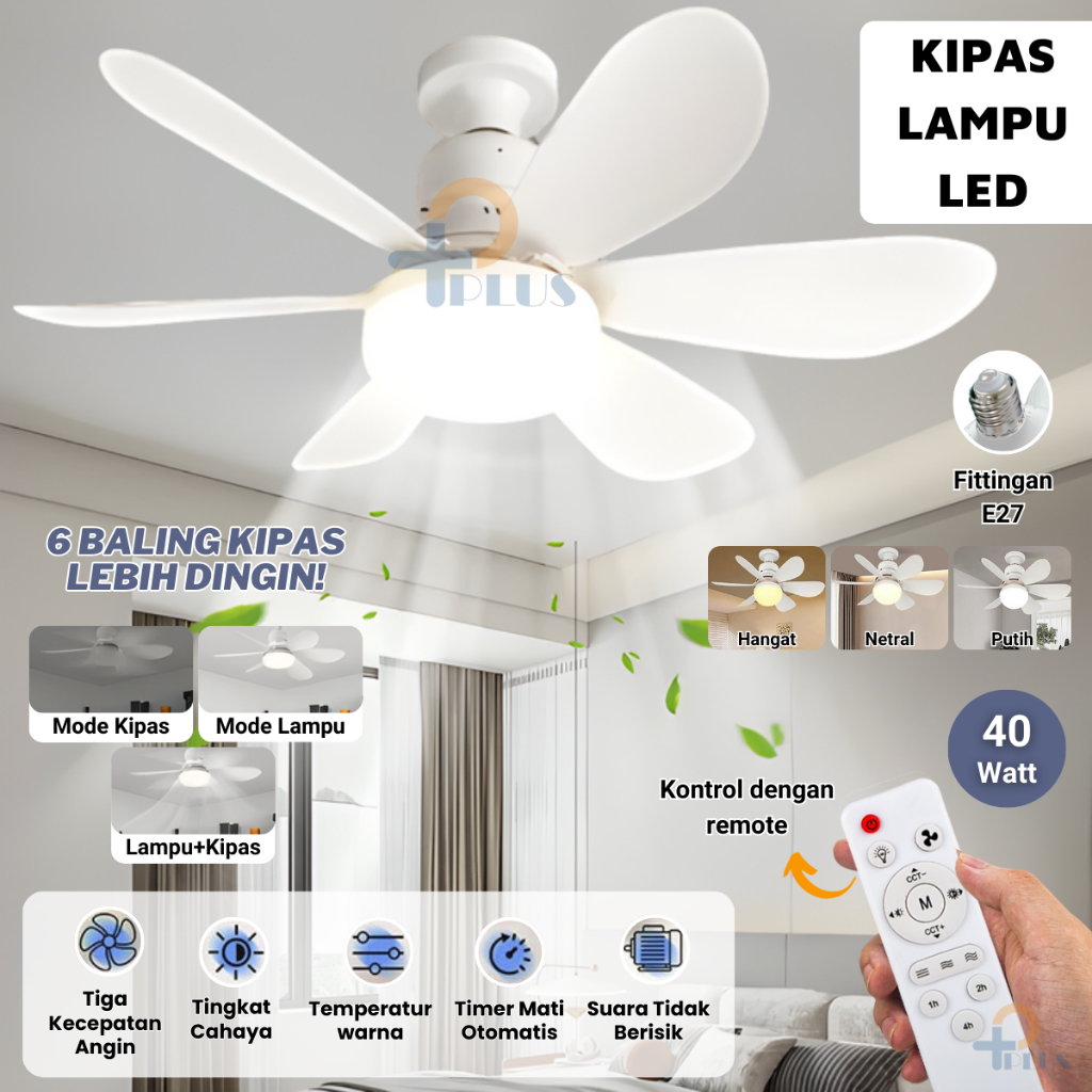 [ Pplus ] Lampu Kipas Gantung langit-langit 40W 6 Baling LED 3 Warna Cahaya Fitting E27 +Remote / Lampu Kipas Led 40W