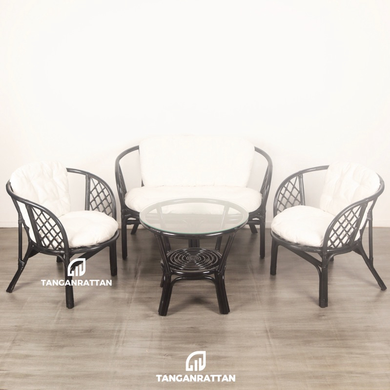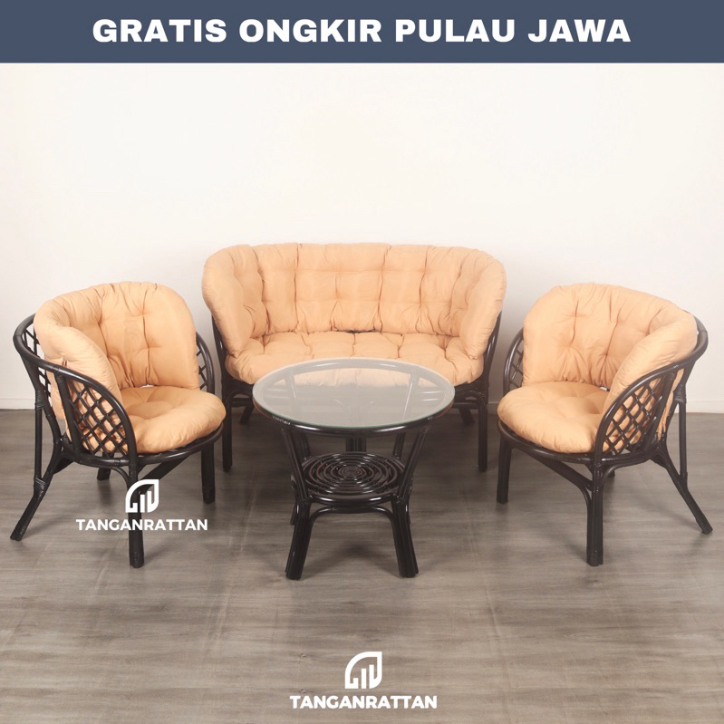 KURSI BAHAMA ROTAN GRATIS BANTAL DAN MEJA KACA 1 SET / KURSI TERAS TAMU ROTAN MINIMALIS