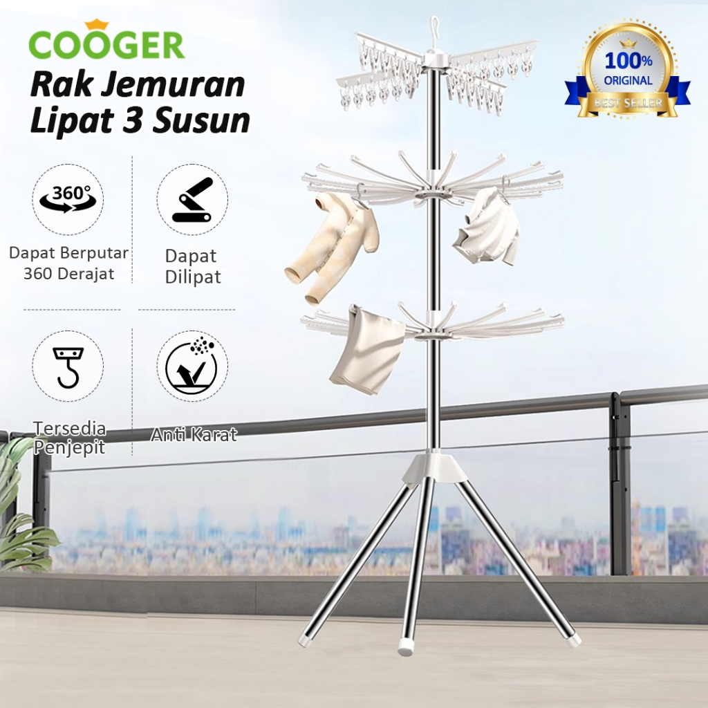COOGER Rak Jemuran Stainless Steel 3 Tingkat Serbaguna 24 Klip Untuk Baju Bayi Handuk Celana Dalam Jilbab Praktis Dan Ko