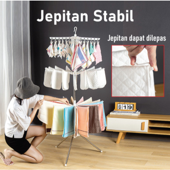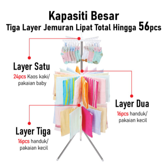 HOMELUXE Jemuran Baju Menara 16 Jari-jari 3 Tingkat Gantungan Baju 24 Jepitan Hanger Lipat Serbaguna