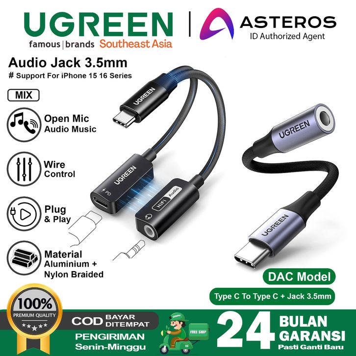 RK - UGREEN Converter Splitter iPhone 15 16 16 Pro 16 Pro Max Type C to Jack 3.5mm DAC Support Audio Open Mic + Fast Ch