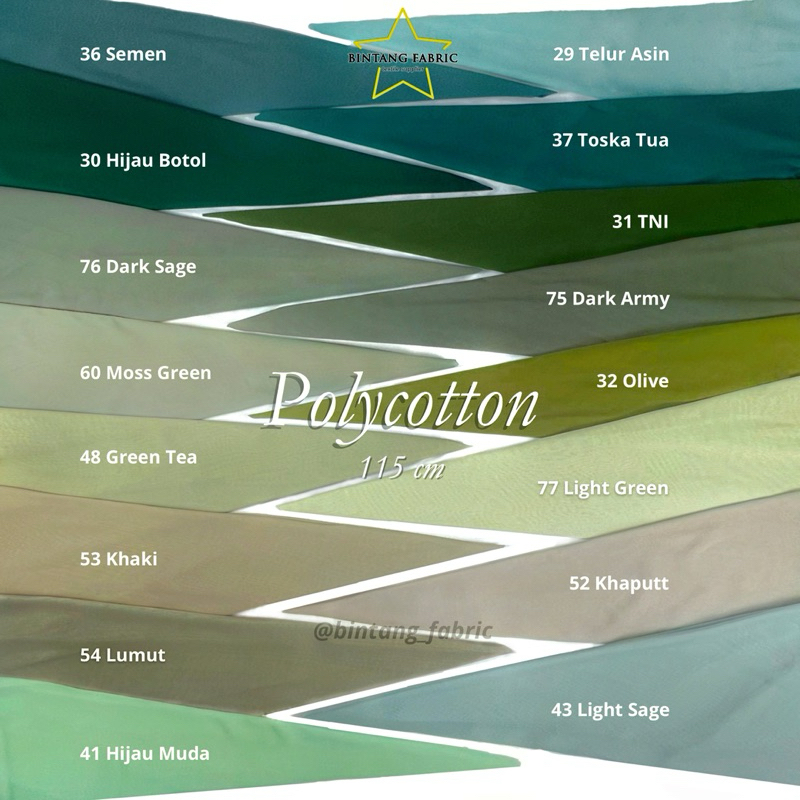 Hitam 1, Navy 2, Putih Bw 3, Putih Bersih 4, Silver 5, Abu Muda 6, Abu Tua 7, Coksu Muda 8, Cokrem 9, Coksu 10, Coklat Muda 11, Milo 12, Coklat 13, Moka 14, Pink Peach 15, Pink Dw 16, Pink Dusty 17, Rose Pink 18, Pink Darwin 19, Fanta 20, Kopi 21, Lavender 22, Orchid 23, Abu Dusty 24, Taro 25, Marun 26, Merah Ati 27, Merah Cabe 28, Telur Asin 29, Hijau Botol 30, TNI 31, Olive 32, Lemon 33, Kubus 34, Salem 35, Semen 36, Toska Tua 37, Biru Muda 38, Biru Brunera 39, Shitake 40, Hijau Muda 41, Ungu Muda 42, Light sage 43, Stone 44, Brownie 45, Caramel 46, Blush 47, Green tea 48, Irish 49, Kuning muda 50, Ivory 51, Khaputt 52, Khaki 53, Lumut 54, Biru artic 55, Biru elektrik 56, Pink sakura 57, Nude 58, Latte 59, Moss green 60, Baby blue 61, Soft blue 62, Smoke blue 63, Dark beige 64, Beige 65, Light silver 66, Sweet taupe 67, Lilac pink 68, Baby purple 69, Biru dusty 70, Gading 71, Peanut 72, Cappucino 73, Coklat hazel 74, Dark army 75, Dark sage 76, Light green 77, Nude pink 78, Salem muda 79, Orange 80, Terakota 81, Merah coral 82, Burgundy 83, Ungu terong 84, Merah bata 85, Bronze 86, Kuning golkar 87, Butter 88, Apricot 89, Pink muda 90, Lilac 91, Biru langit 92, Denim muda 93, Denim tua 94, Biru turkish 95, Hijau botol muda 96, Hijau lembut 97, Mint 98, Warna lain dikatalog
